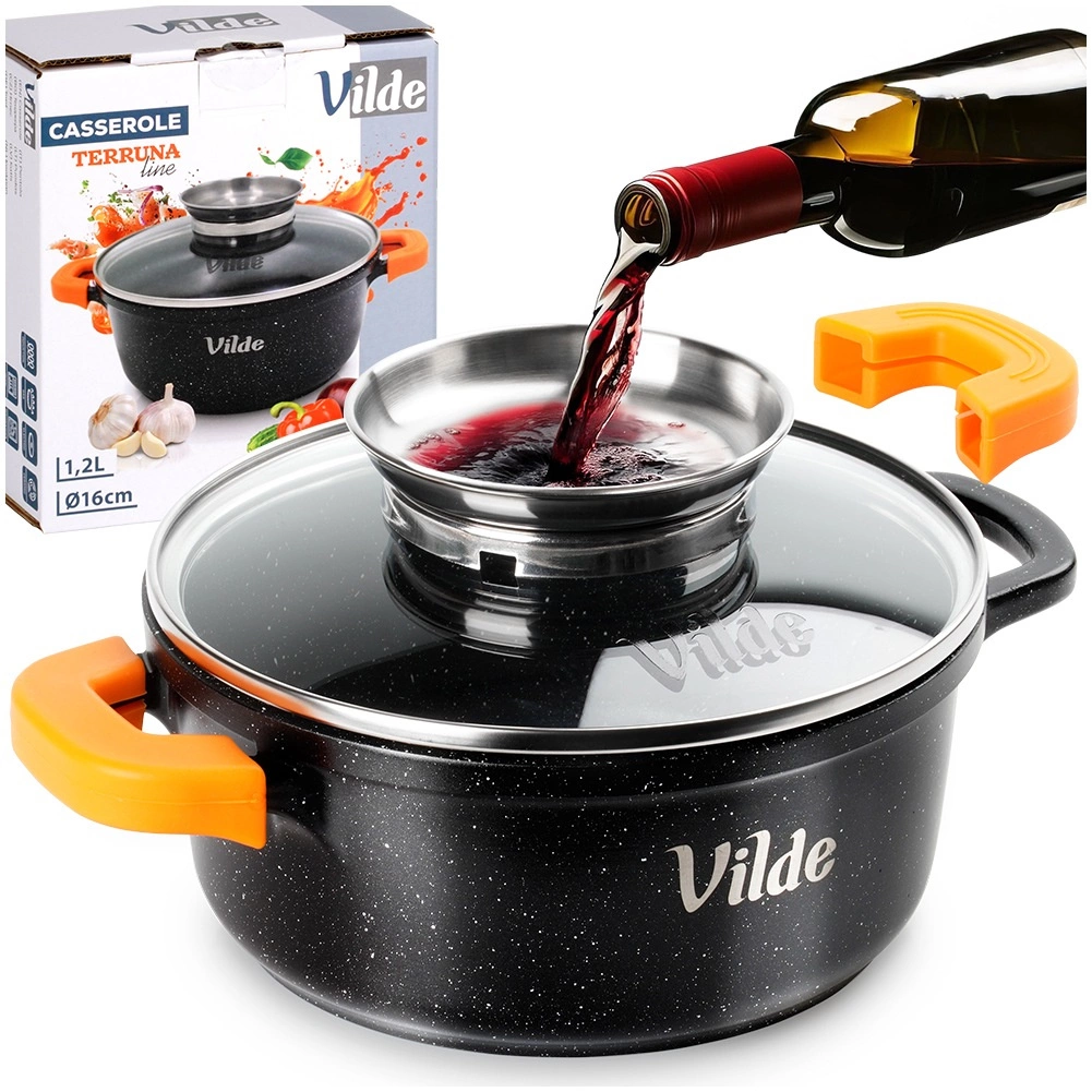 Univerzalen lonec iz litega aluminija z granitnim nelepljivim premazom je idealen za vsakodnevno kuhanje – od juh, omak in dušenega mesa do peke. Stekleni pokrov z nerjavnim ročajem hkrati služi kot dozirnik tekočih začimb, zato lahko prilivate brez dvigovanja pokrova in tako ohranite stalno temperaturo ter aromo jedi.