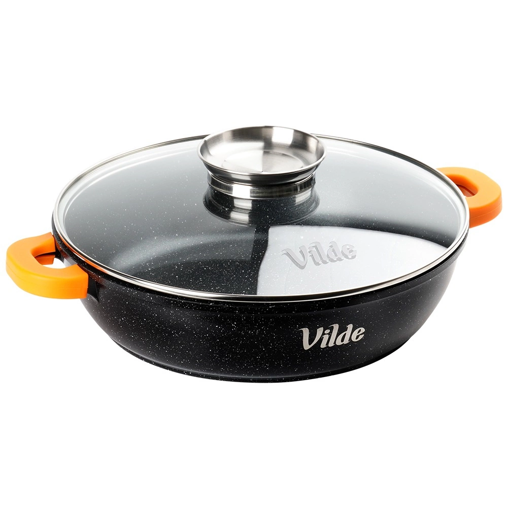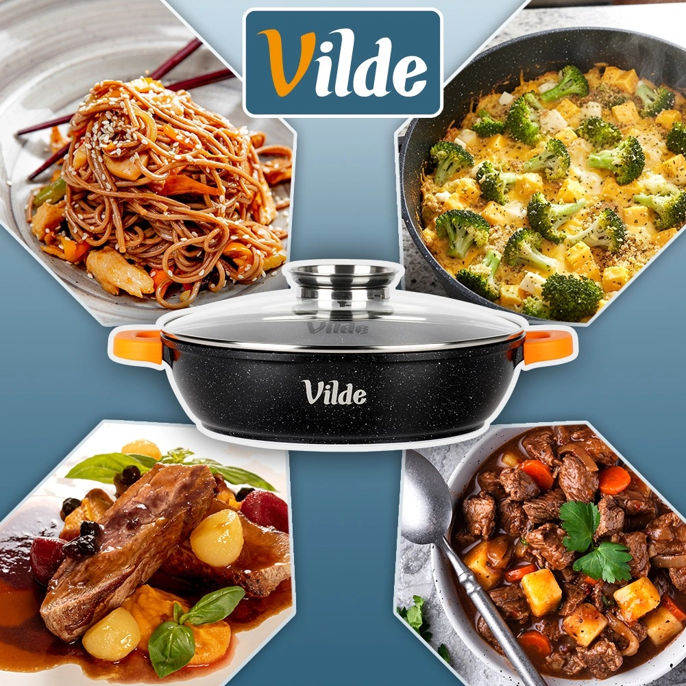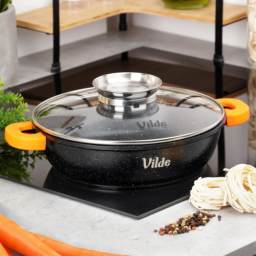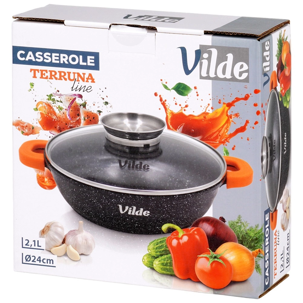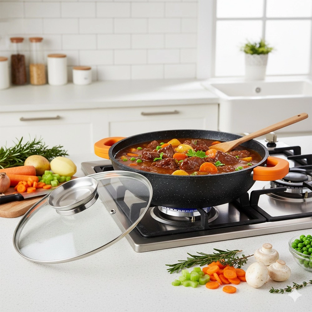 Globoka ponev TERRUNA AROMA 24 cm je univerzalna rešitev za vsakodnevno kuhanje – od hitrega cvrtja in dušenja do gratiniranja. Odporno aluminijasto ohišje z neprijemljivo granitno plastjo zagotavlja enakomerno porazdelitev toplote in enostavno sproščanje jedi. Stekleni pokrov z nerjavnim ročajem in integriranim dozirnikom omogoča dolivanje vode, vina ali omak brez dvigovanja pokrova.
