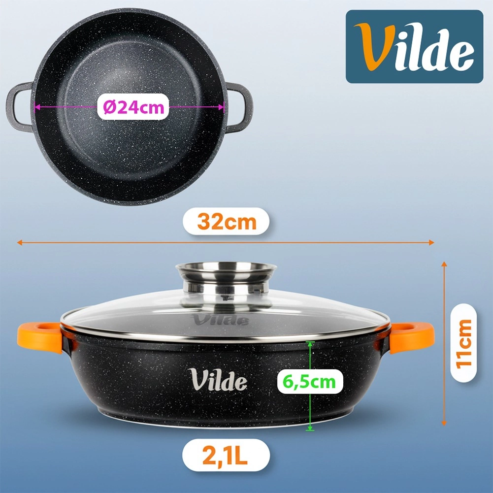 Praktična globoka ponev s prostornino 2,1 l s steklenim pokrovom z dozirnikom in neprijemljivo granitno prevleko za kuhanje z minimalno količino olja. Združljiva z vsemi vrstami štedilnikov, vključno z indukcijo, primerna tudi za pečico brez pokrova do 200 °C. Priloženi so nedrseči silikonski ovitki na ročajih za varno prenašanje.