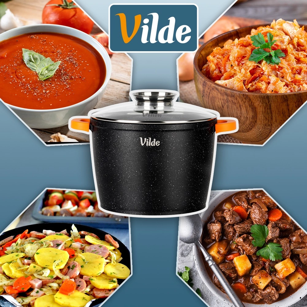 Velikokapacitetni granitni lonec Vilde TERRUNA AROMA s prostornino 6,7 l in premerom 24 cm je idealen za juhe, golaže in dušenje mesa. Zahvaljujoč neprijemljivemu granitnemu premazu kuhate z minimalno količino maščobe, stekleni pokrov z dozirnikom omogoča dolivanje tekočin brez dvigovanja pokrova, silikonski protidrsni nastavki na ročajih pa zagotavljajo varen oprijem. Primerno za plin, elektriko, keramiko in indukcijo, v pečici do 200 °C (brez pokrova) in v pomivalnem stroju.