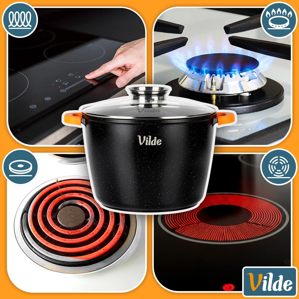 Univerzalna uporaba: plin, elektrika, steklokeramika, indukcija in peka v pečici do 200 °C (brez pokrova). Originalni izdelek znamke VILDE iz linije TERRUNA AROMA.