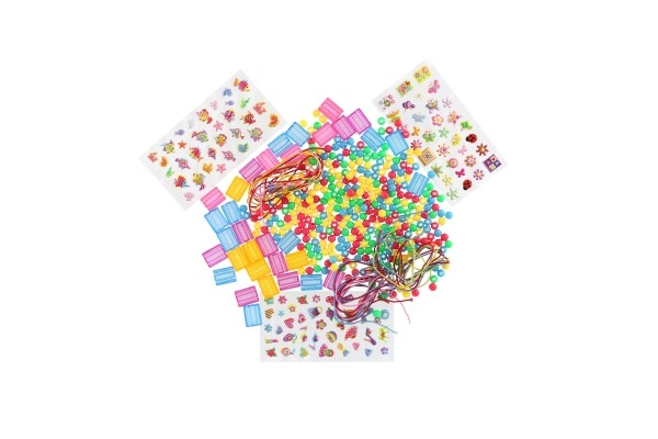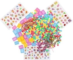 V paketu so kvadratni delčki, plastične perlice različnih oblik in barv, prožne elastike ter penaste nalepke za dovršitev edinstvenega sloga. Odlična izbira za ustvarjanje doma, otroške zabave in kot darilo.