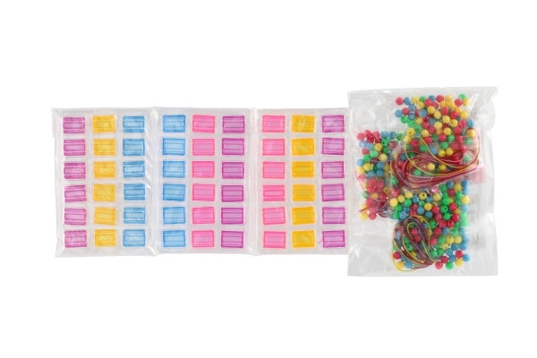 Pisane perlice, kvadratni delčki, elastike in nalepke – samo odprite in začnite ustvarjati brez dodatnih nakupov.