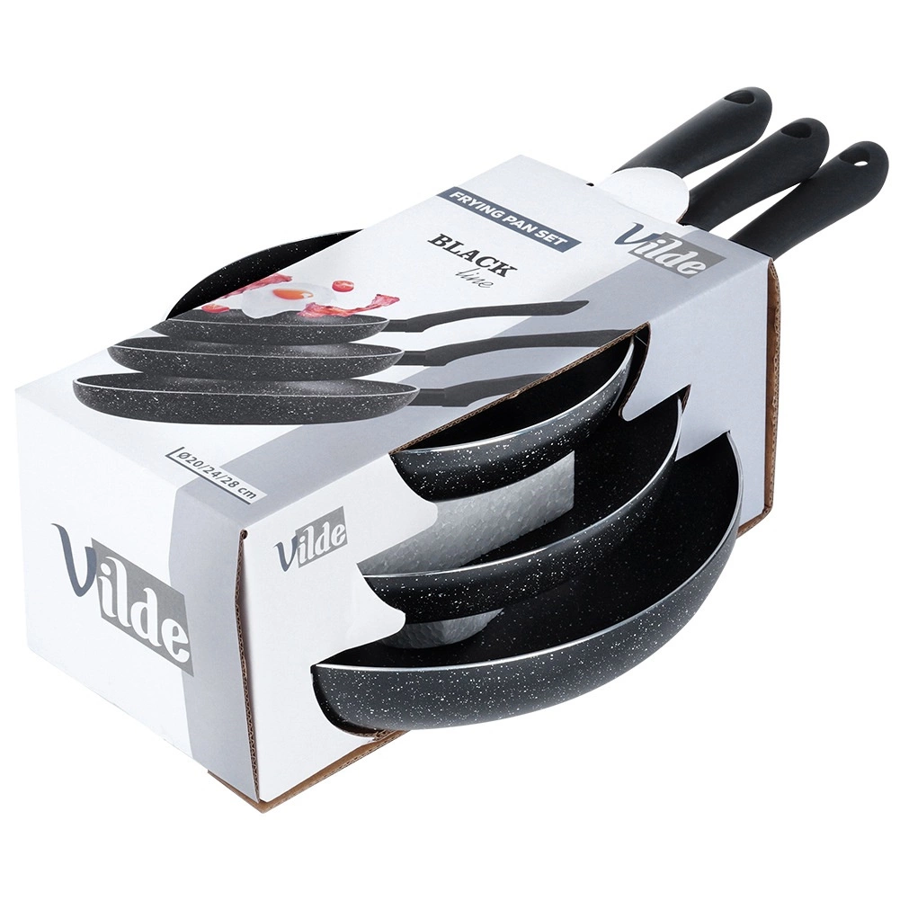 Set treh ponev BLACK LINE združuje kakovosten lit aluminij za hitro porazdelitev toplote in trpežno neprijemljivo granitno plast za bolj zdravo kuhanje. Zahvaljujoč trem velikostim zlahka pripravite jajca, zelenjavo in steake – vedno z enakomerno distribucijo toplote in preprostim sproščanjem jedi.