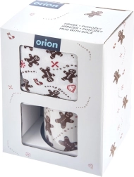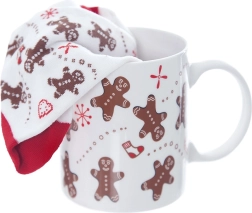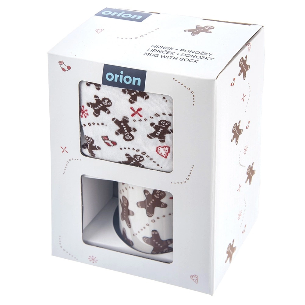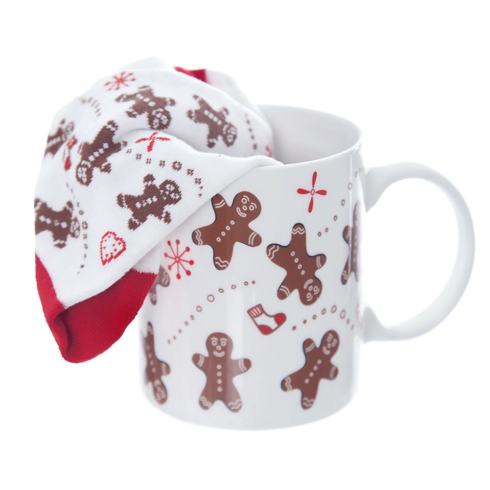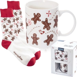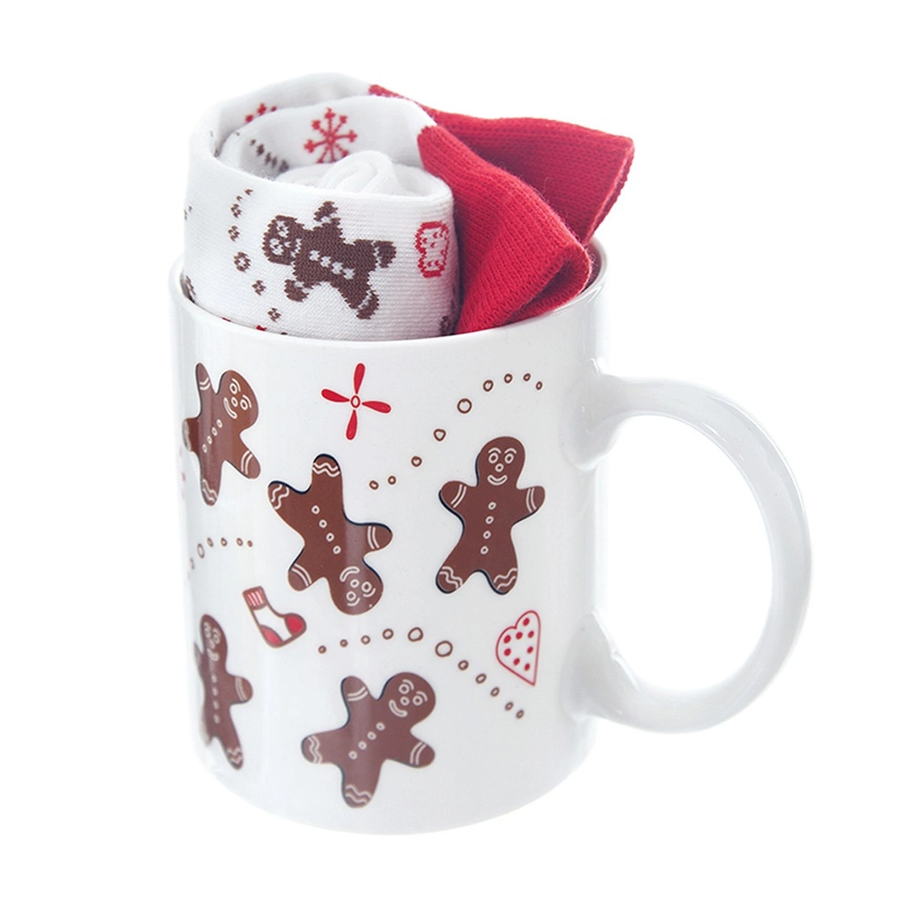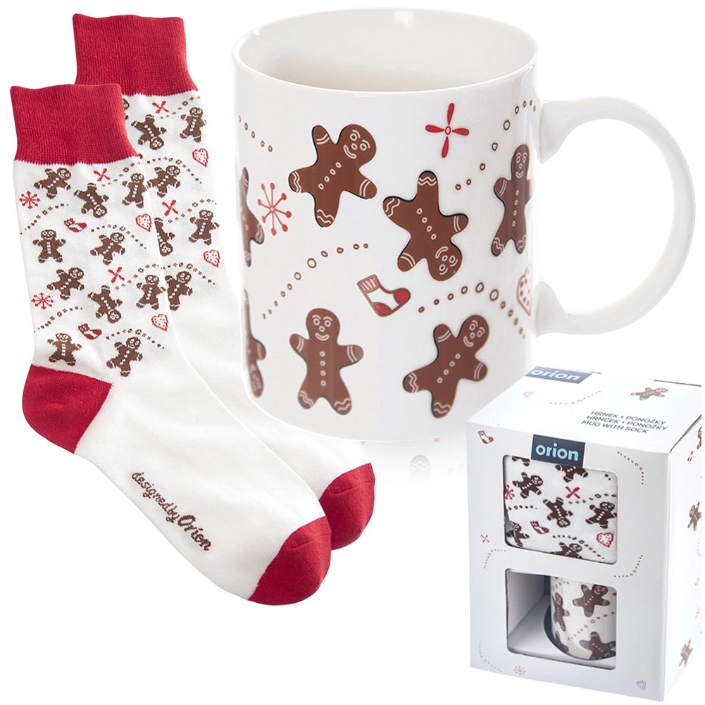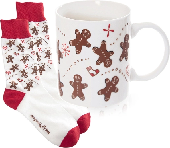 Stajliš darilni komplet z motivom medenjakov: keramični lonček s prostornino 350 ml in mehke nogavice (vel. 38–40). Praktičen in dekorativen, idealen za zimske večere ob kavi ali kakavu. Lonček ima klasičen ročaj, primeren je za mikrovalovno pečico, nogavice se lahko perejo na 30 °C.
