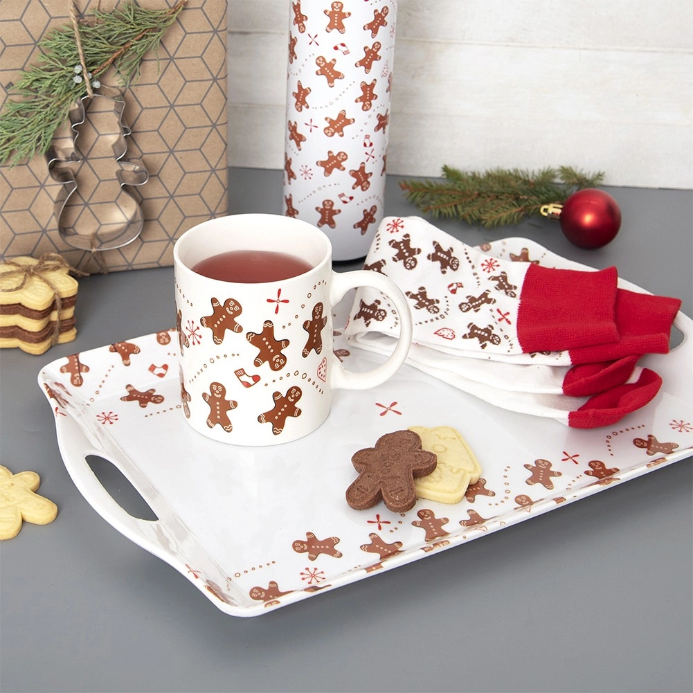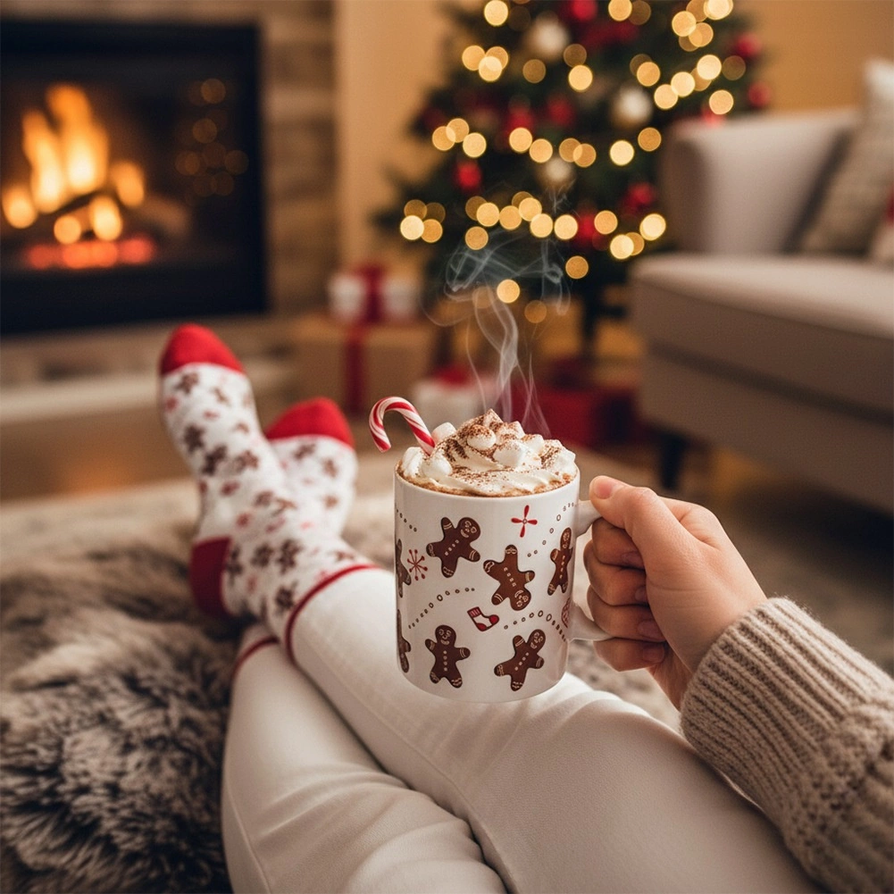 Lonček za vroče napitke in mehke nogavice z motivom medenjakov ustvarita popoln duo za filmske večere in sprostitev ob kaminu.
