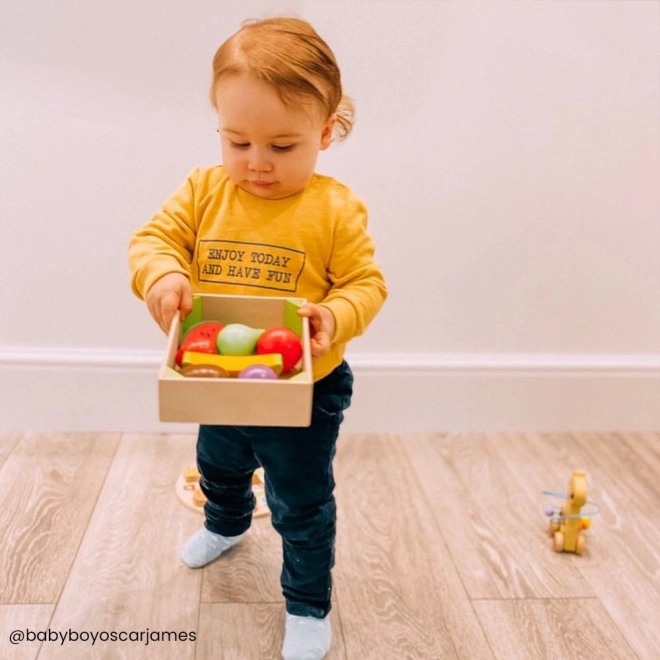 V tej škatli boste našli različno leseno sadje, kot so banane, jabolka, jagode ali hruške. Za otroke je to odlična igrača, ki jih ne le zabava, ampak jih tudi izobražuje o pomenu zdrave in uravnotežene prehrane. Igra je zasnovana za razvijanje fine motorike, pri igranju pa se otroci tudi naučijo, od kod prihaja njihova hrana in kako se pripravlja.
