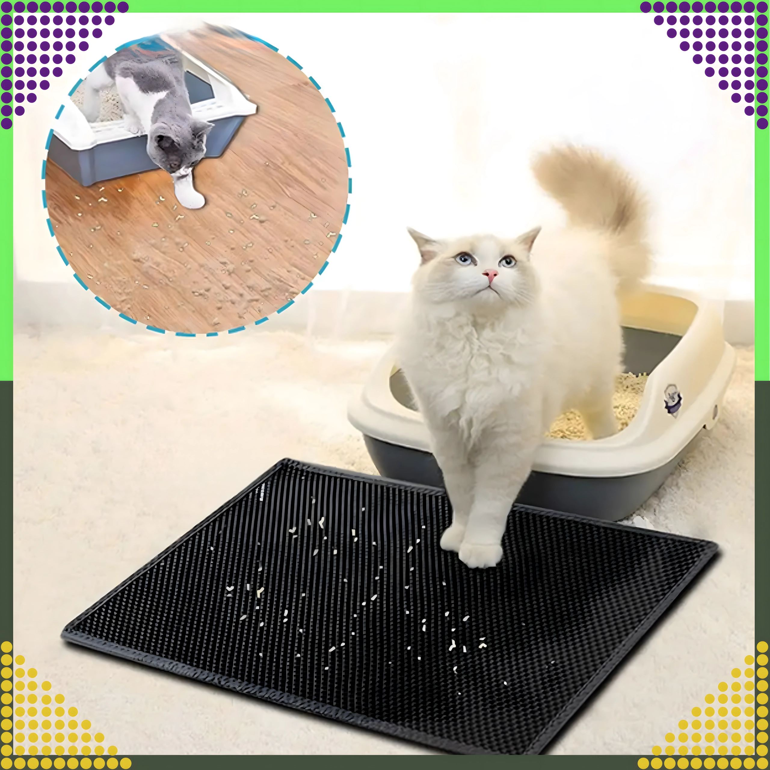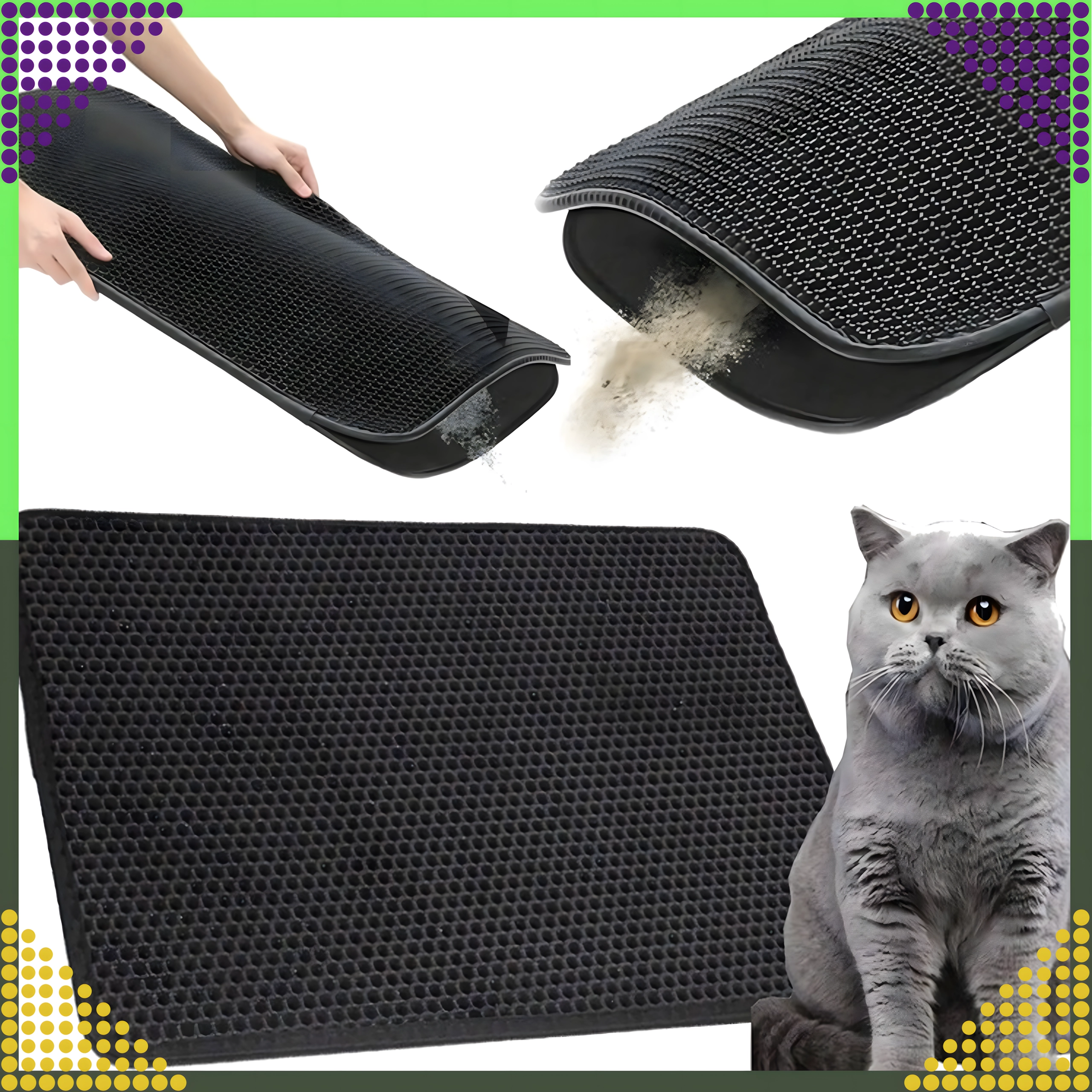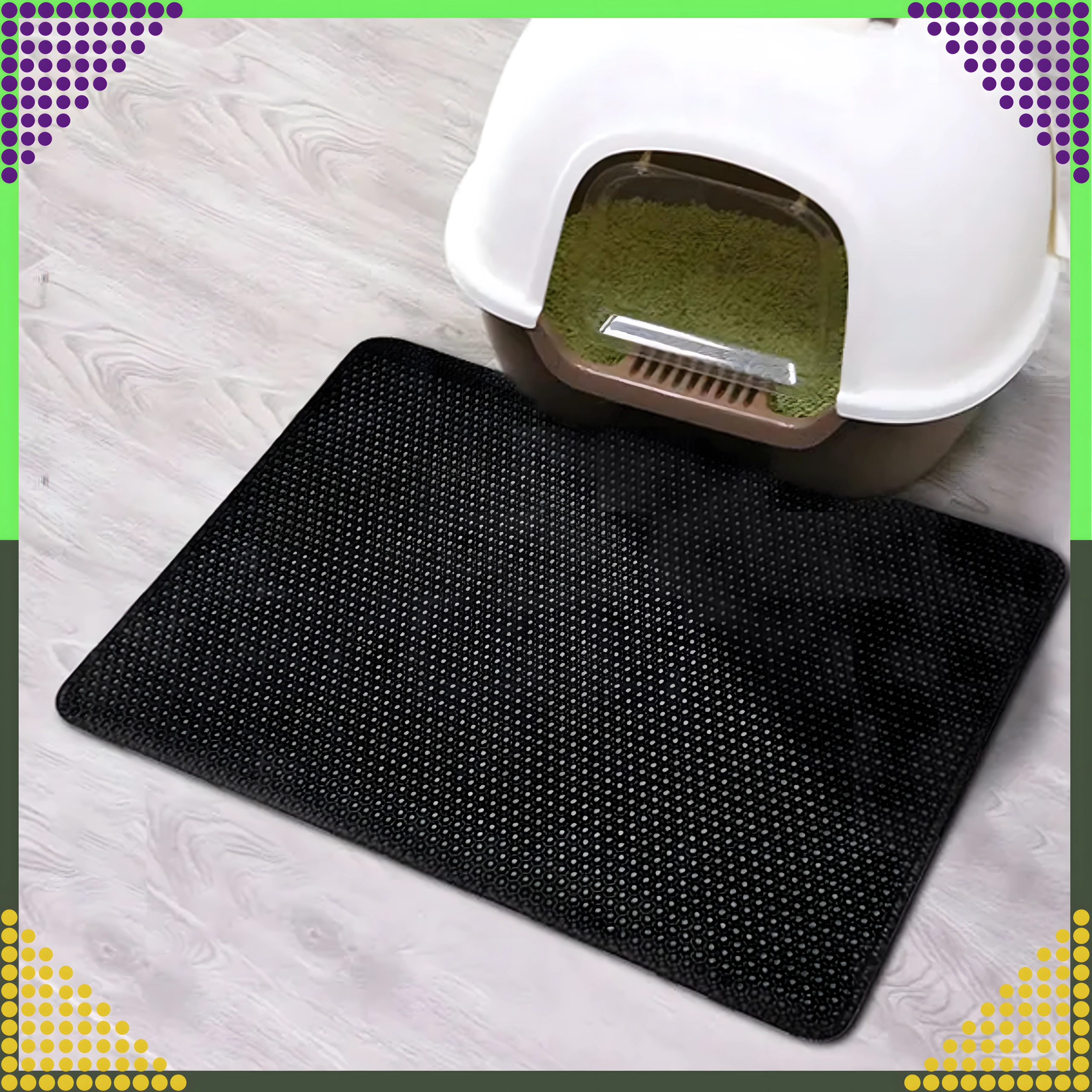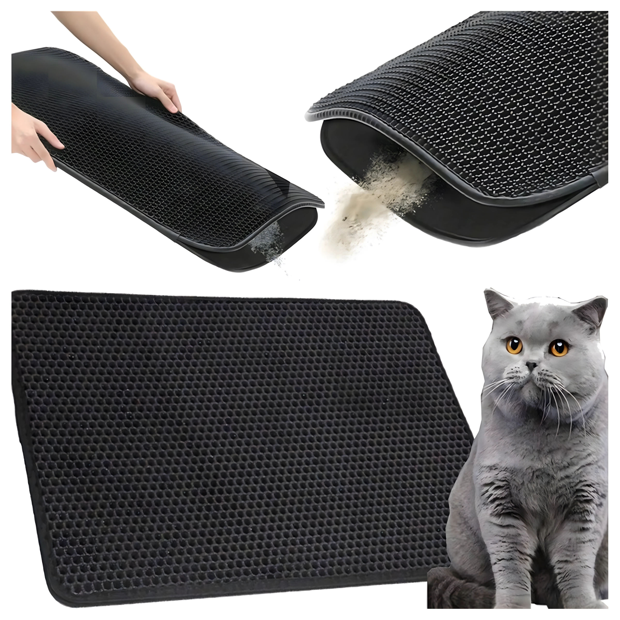 Material je vzdržljiv, vodoodporen in enostavno omojen – umazanijo lahko stresete, iztresete, posesate ali sperete z vodo. Velikost XXL 60 × 45 cm nudi široko površino za udoben izhod in ustreza vsem običajnim vrstam mačjih stranišč.