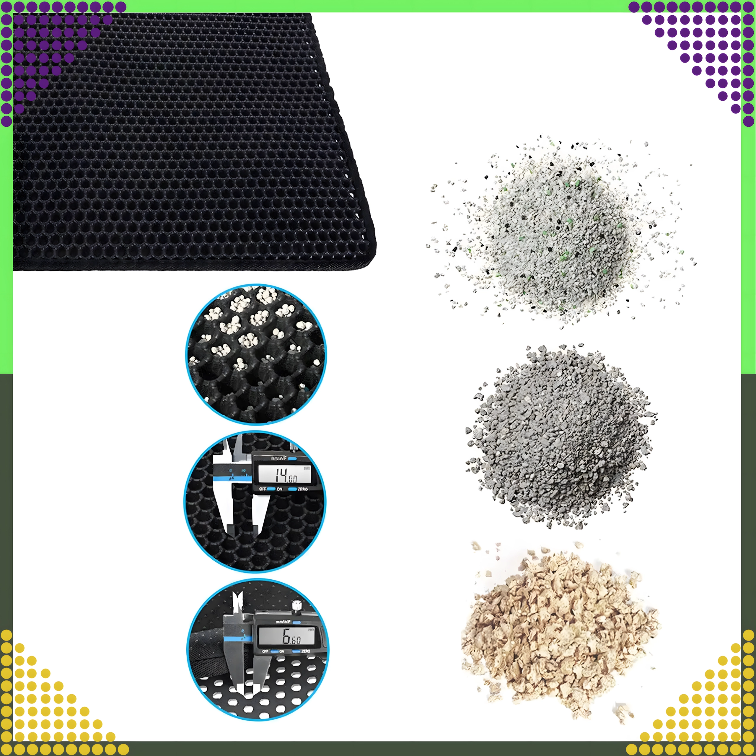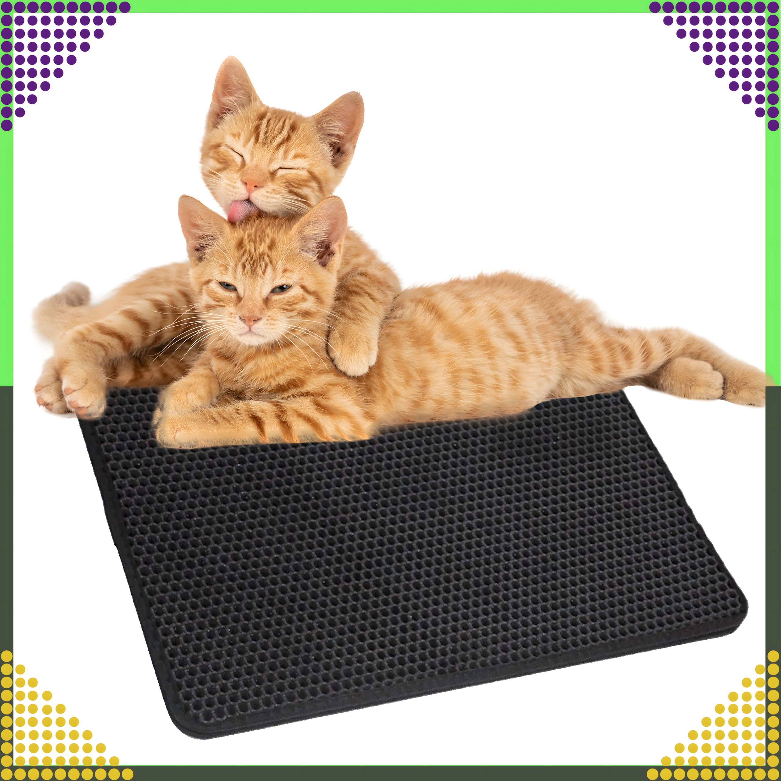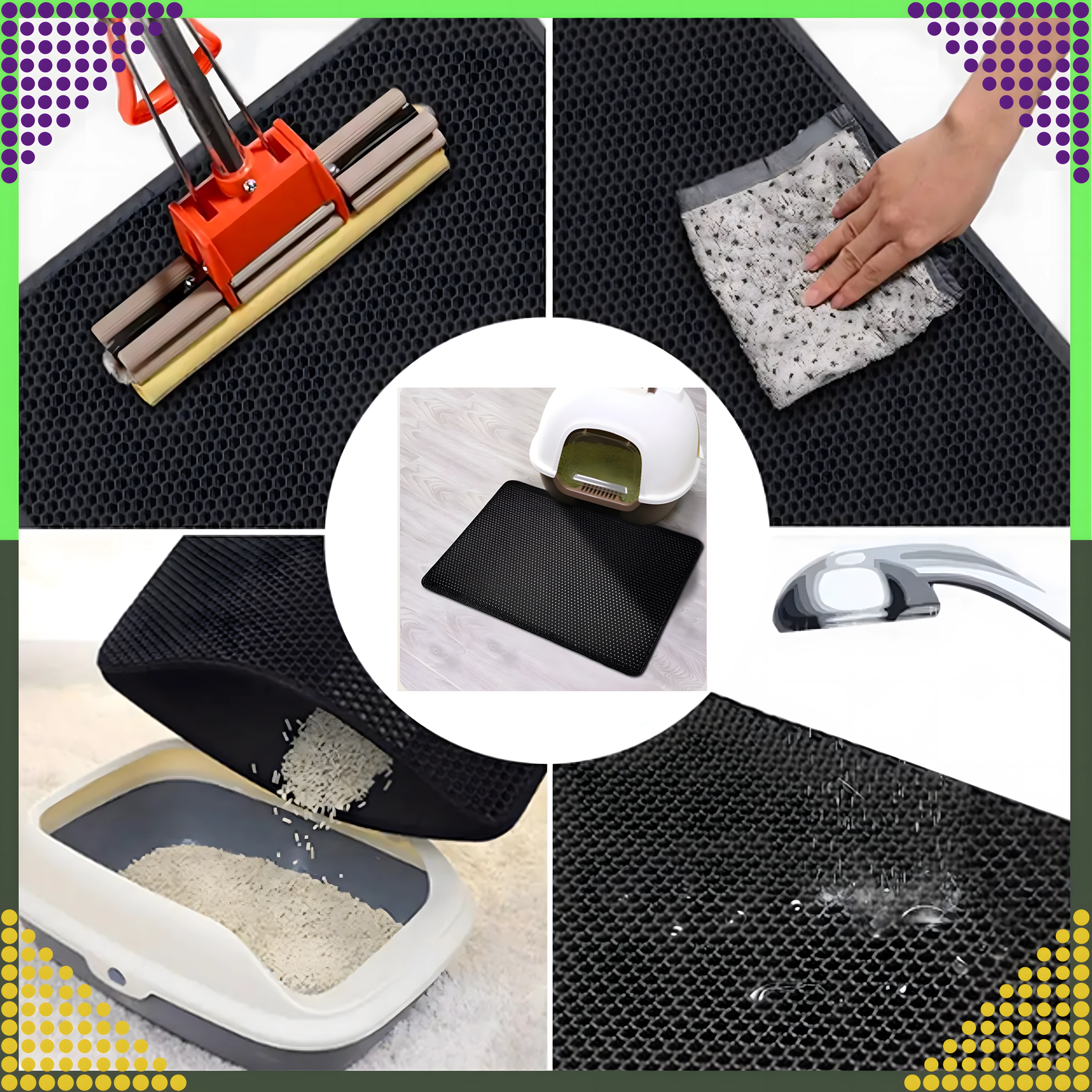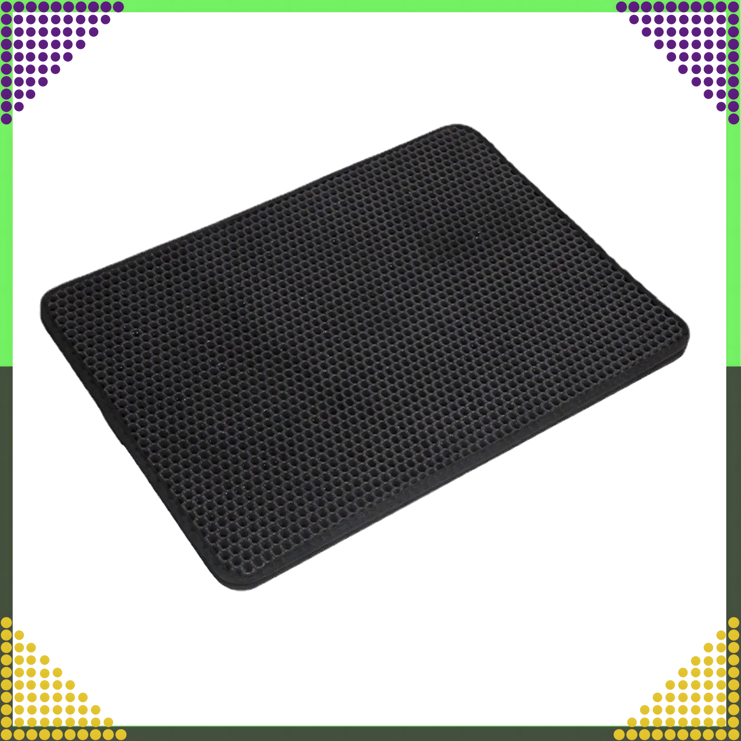Material je vzdržljiv, vodoodporen in enostavno omojen – umazanijo lahko stresete, iztresete, posesate ali sperete z vodo. Velikost XXL 60 × 45 cm nudi široko površino za udoben izhod in ustreza vsem običajnim vrstam mačjih stranišč.