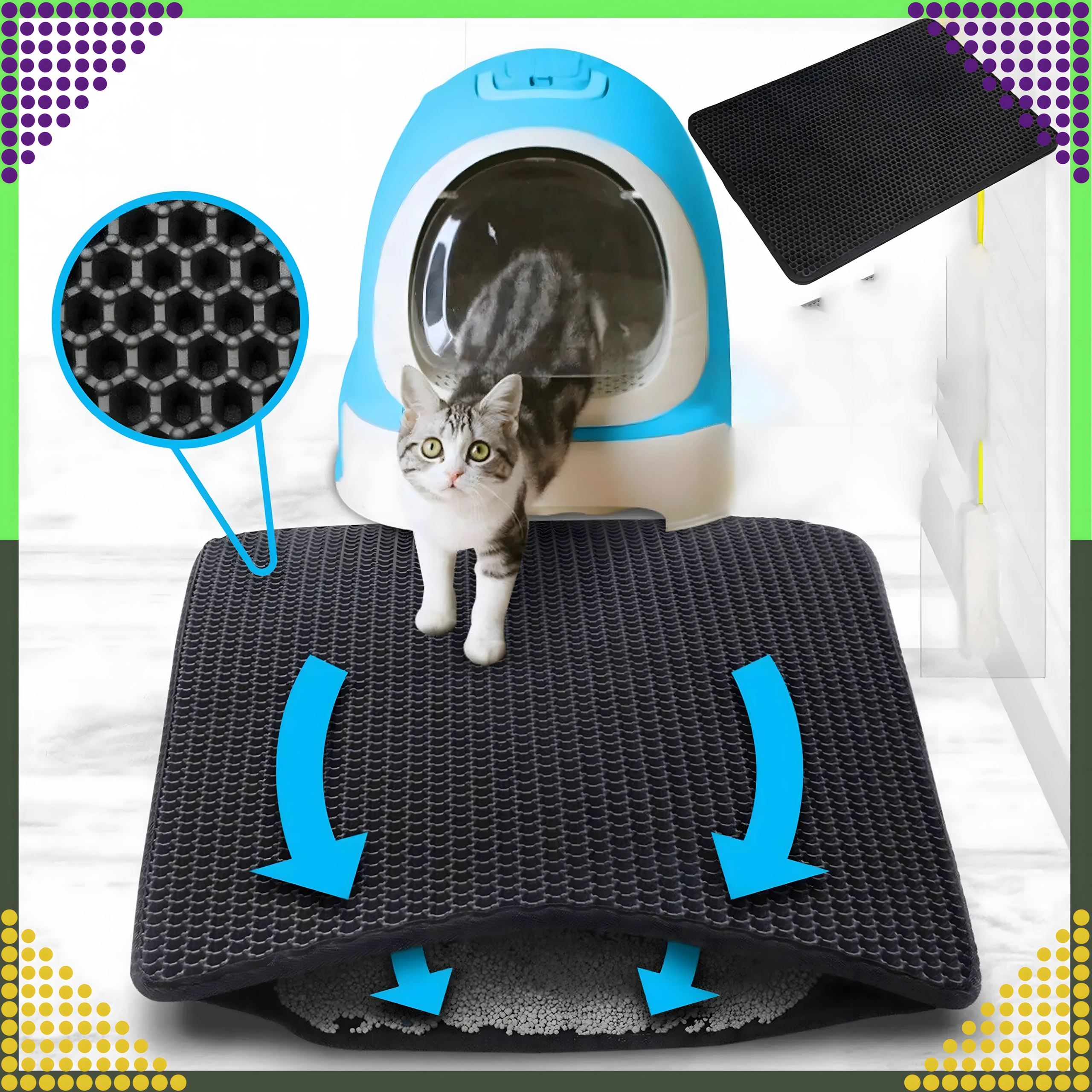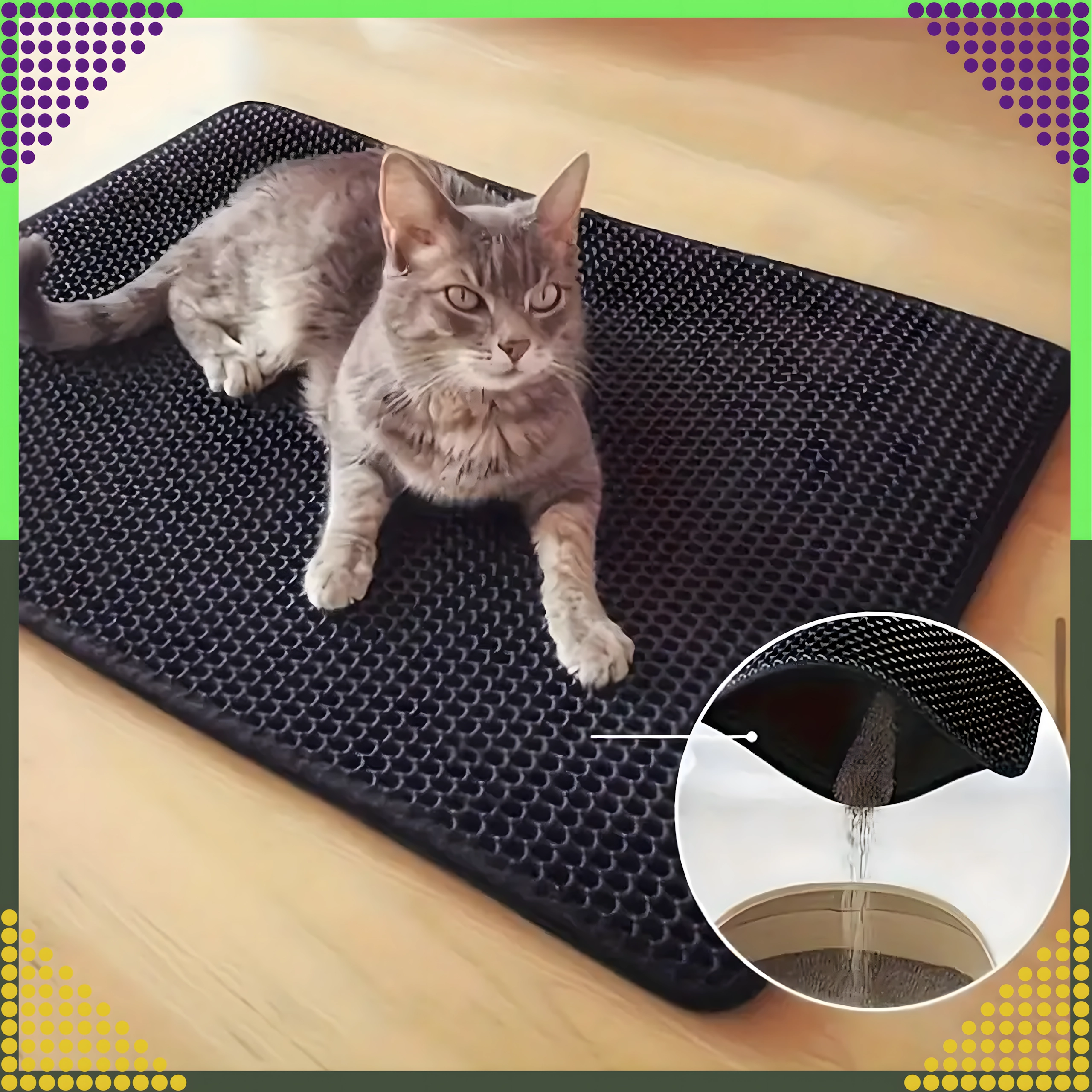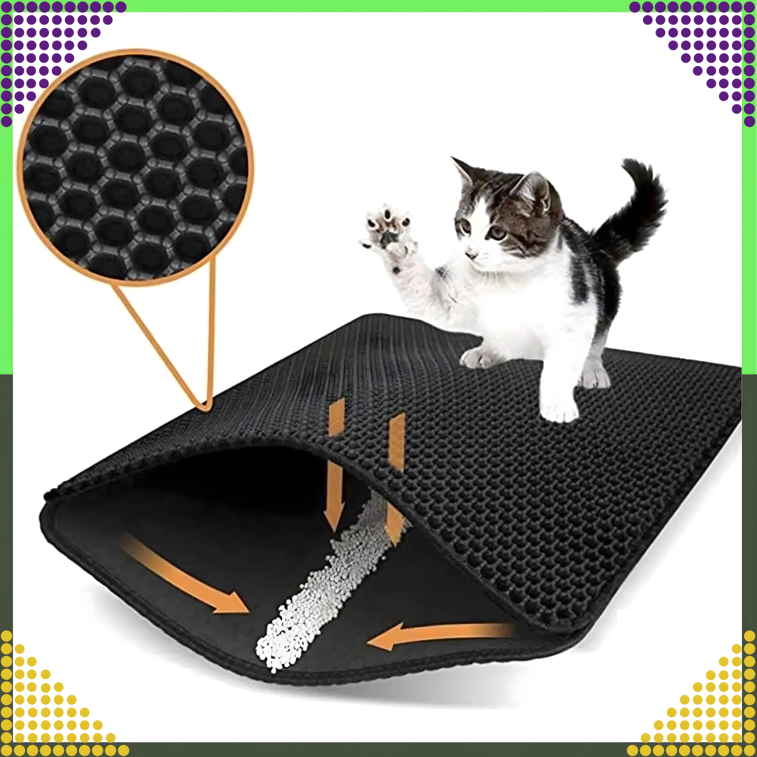 Praktična in higienska podloga z dvojno plastjo je zasnovana tako, da zajame drobce stelje s tačk takoj po izhodu iz stranišča. Zgornja satasta plast prepušča granule v spodnji žep, kjer se varno zbirajo – nato jih preprosto izpraznite nazaj v stranišče ali v koš. Zahvaljujoč nedrseči spodnji strani podloga ne drsi in ostane stabilno na mestu.