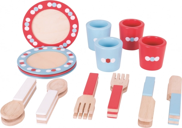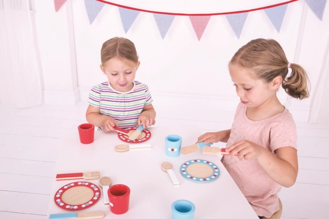 Ta barvit leseni jedilni komplet je zasnovan za mlade začetnike, ki želijo pripraviti lastne večerje in organizirati čajanke. Odličen dodatek vsaki leseni igralni kuhinji, komplet vsebuje: