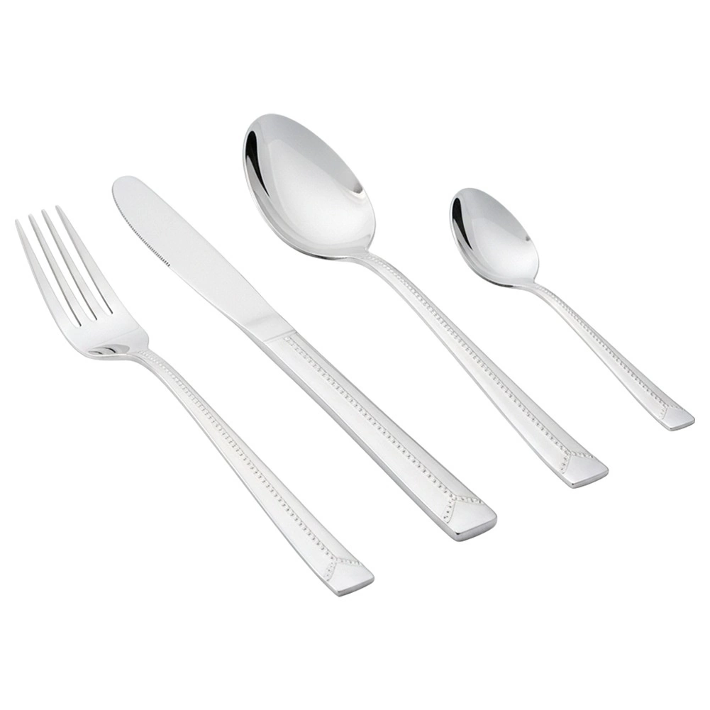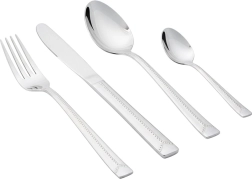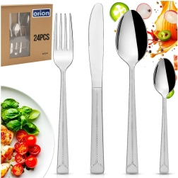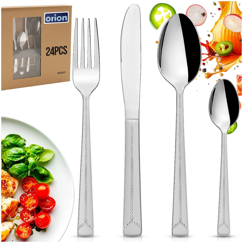 Eleganten set pribora za 6 oseb vsebuje 24 delov za vsakodnevno uporabo in praznično pogostitev. Izdelano iz kakovostnega nerjavečega jekla z obstojno površino in dekorativnim dizajnom. Primerno za pomivalni stroj, vendar je za dolgotrajen sijaj priporočljivo ročno pomivanje. Klasičen in brezčasen videz se odlično ujema s katerim koli namiznim servisom.