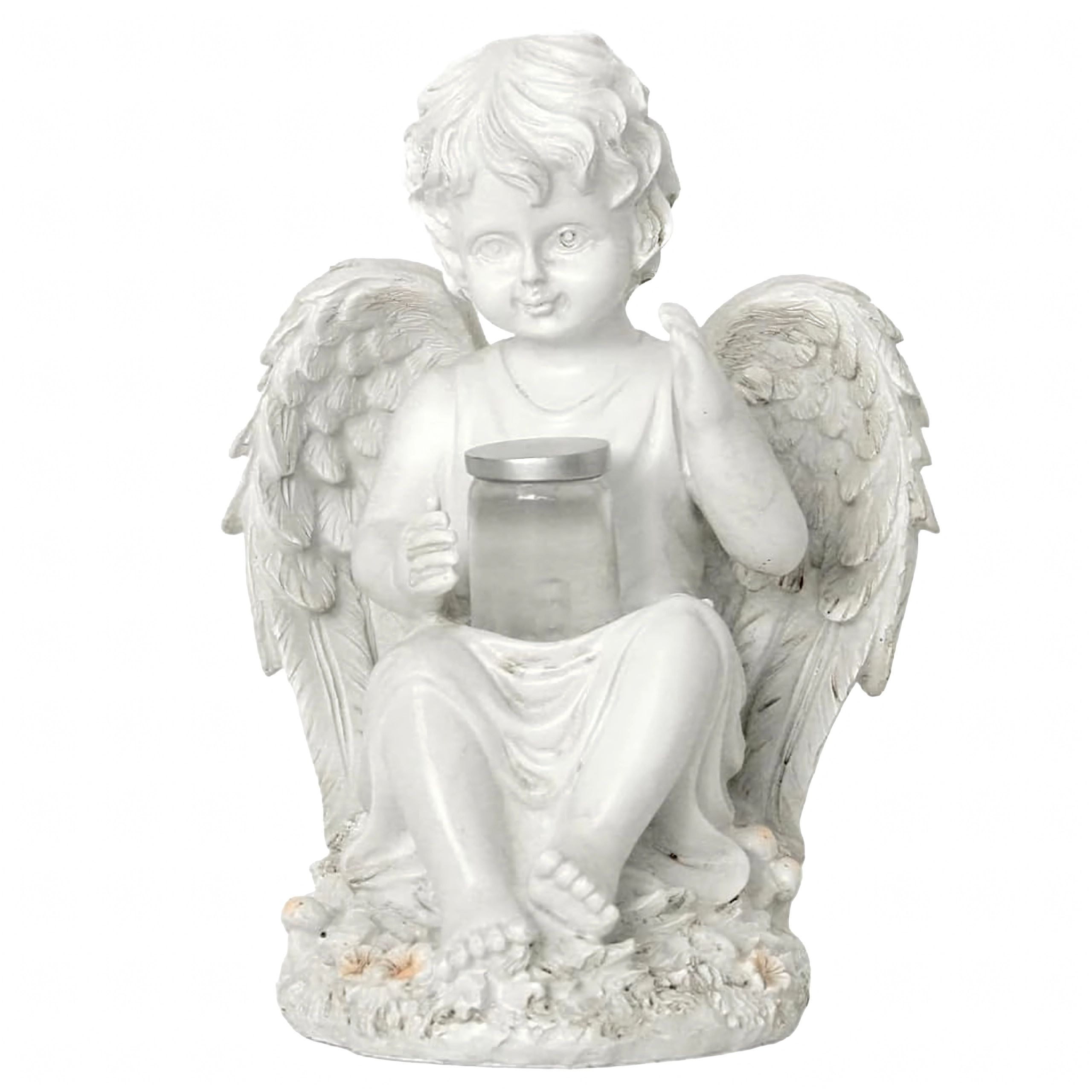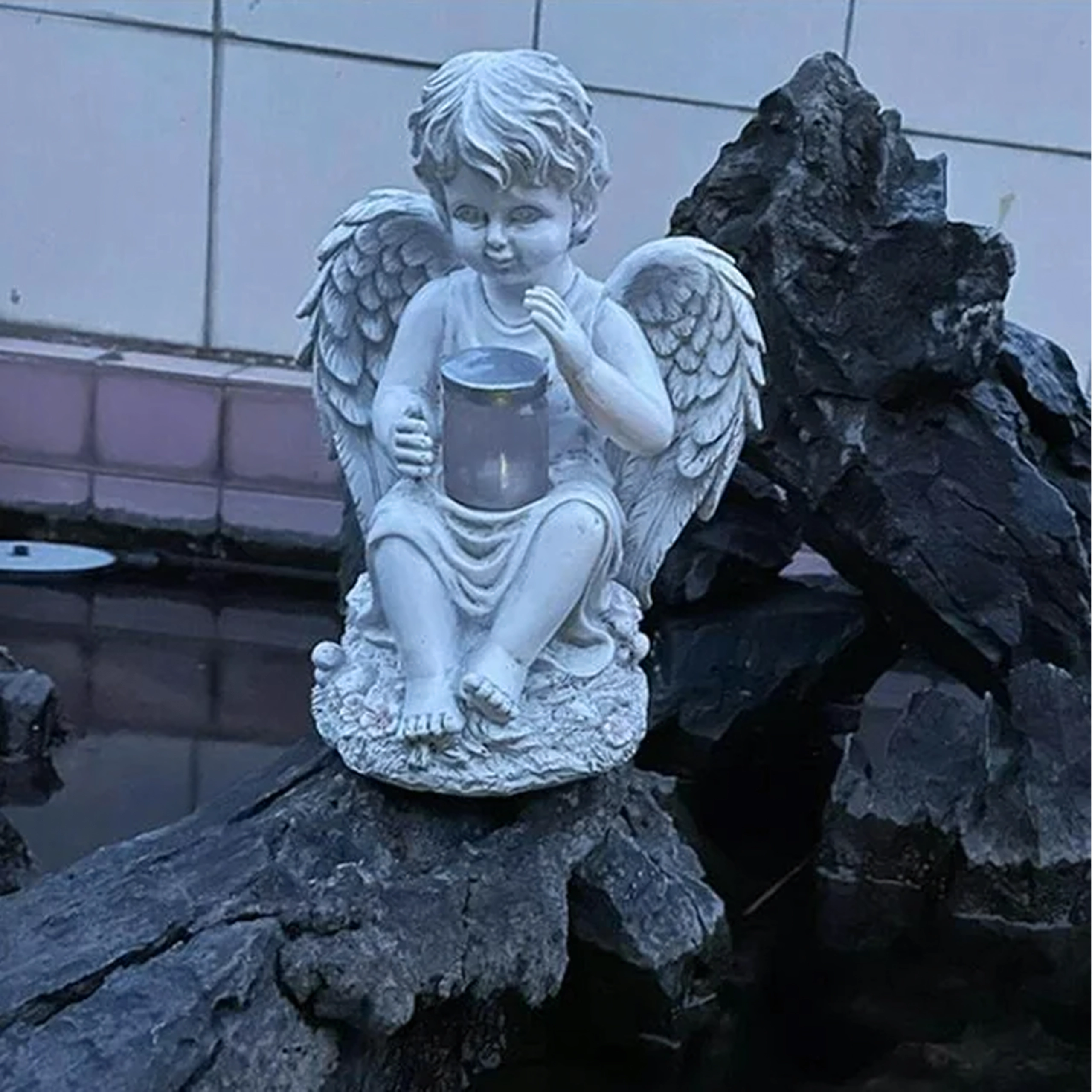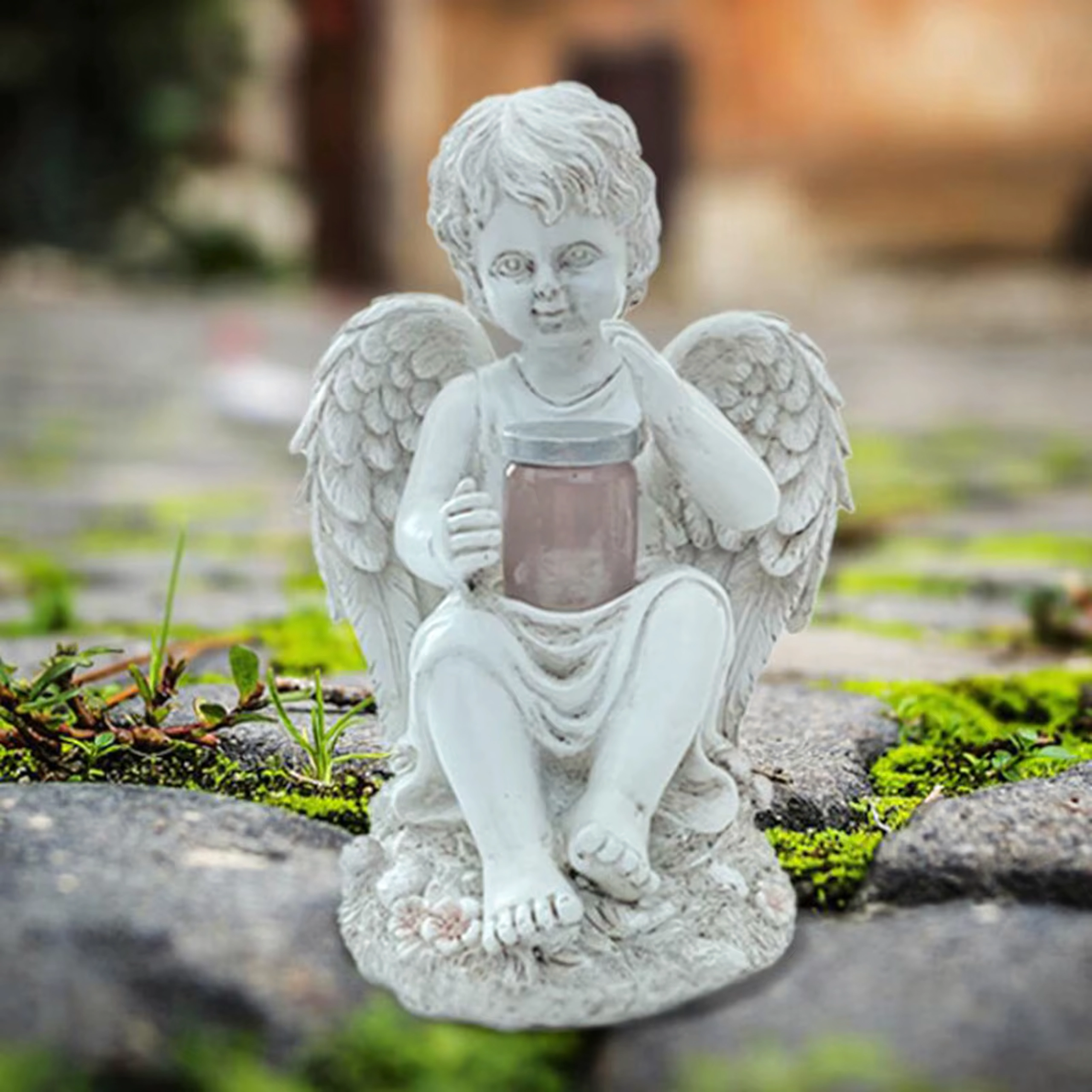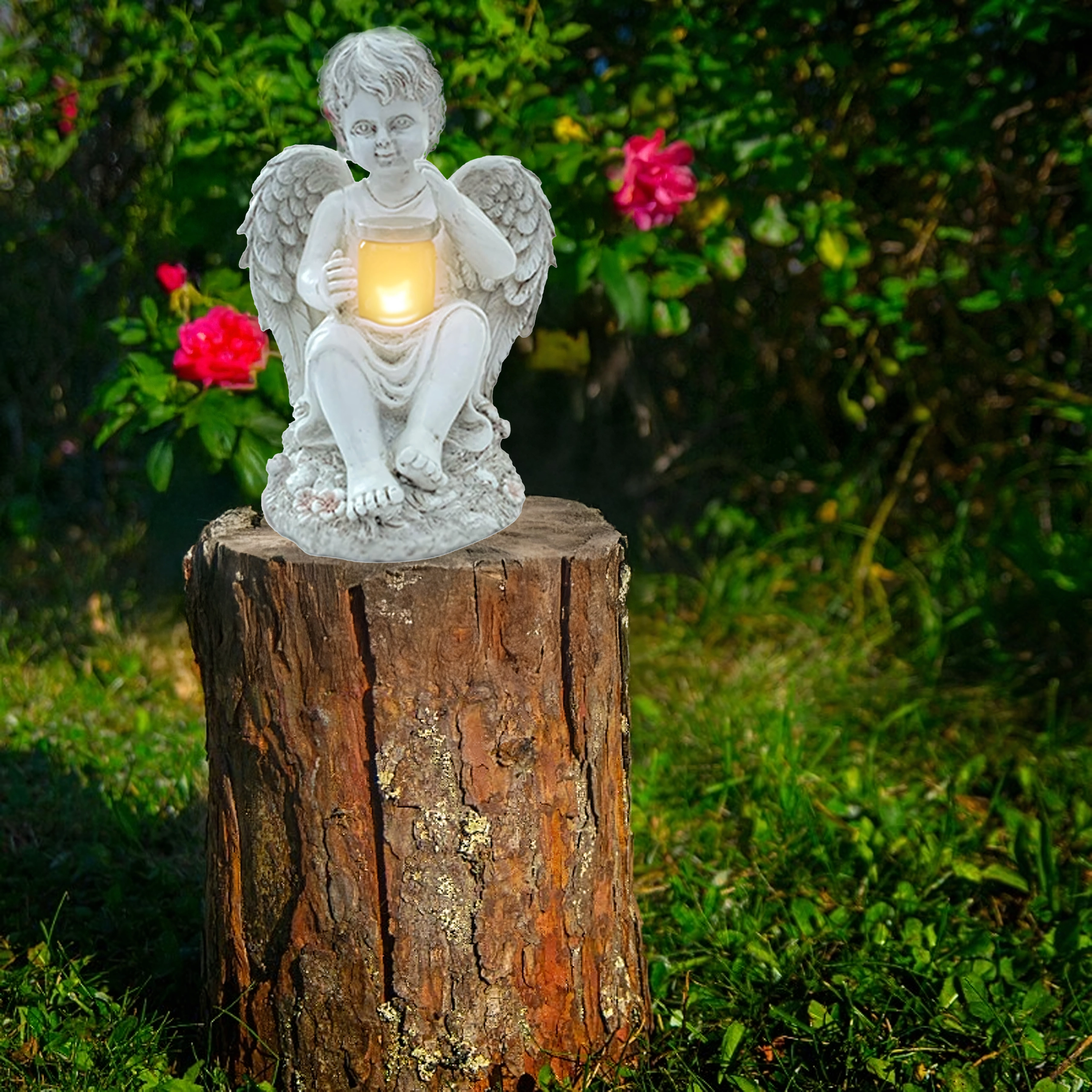 Nežna, topla svetloba v posodici, ki jo angel drži, ustvarja pomirjujoče večerno vzdušje na vrtu ali pri spominskem obeležju.