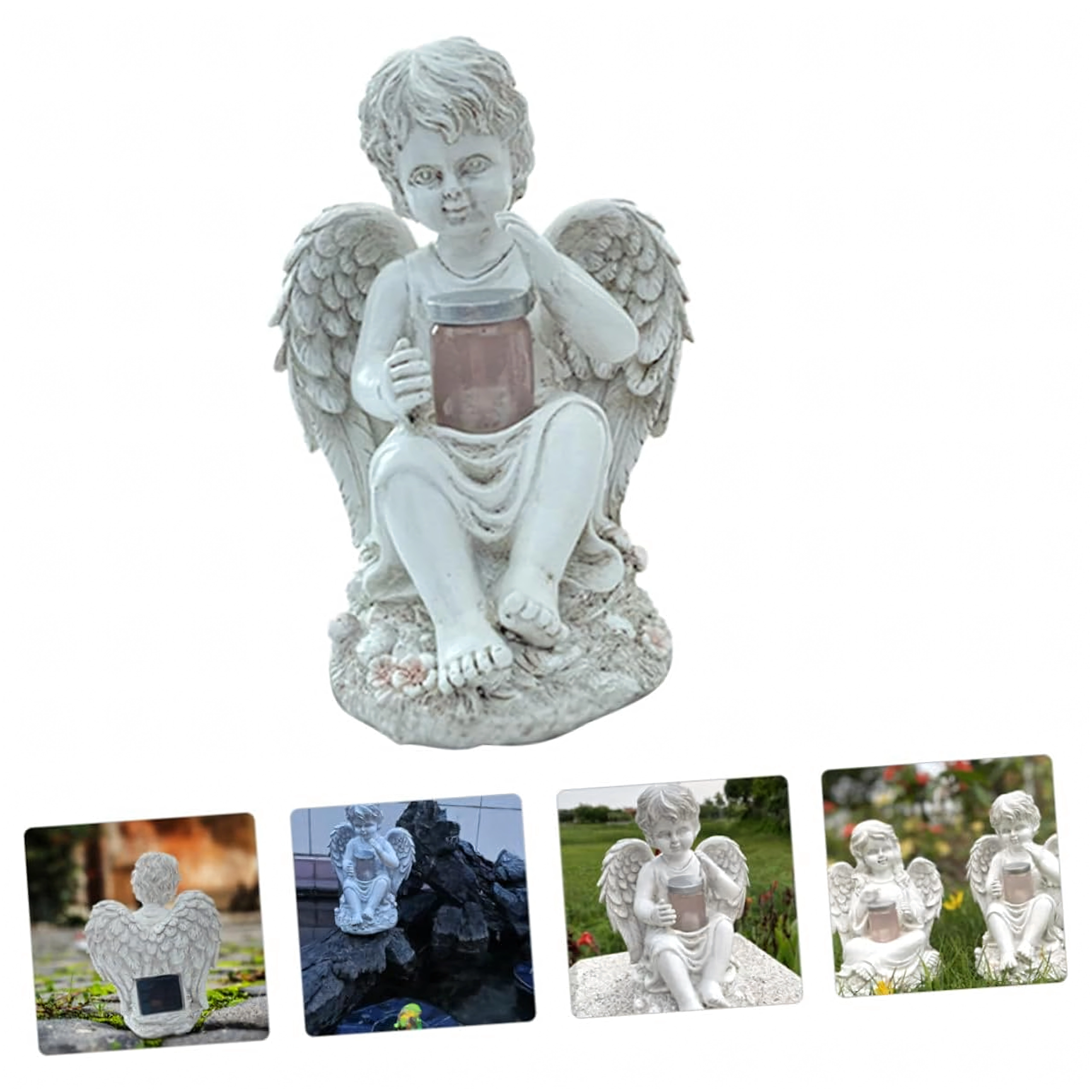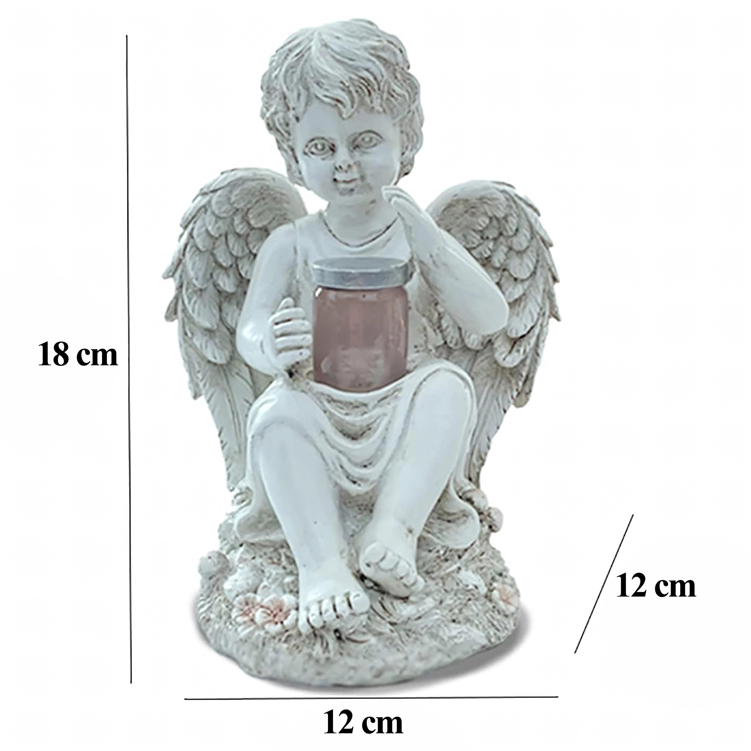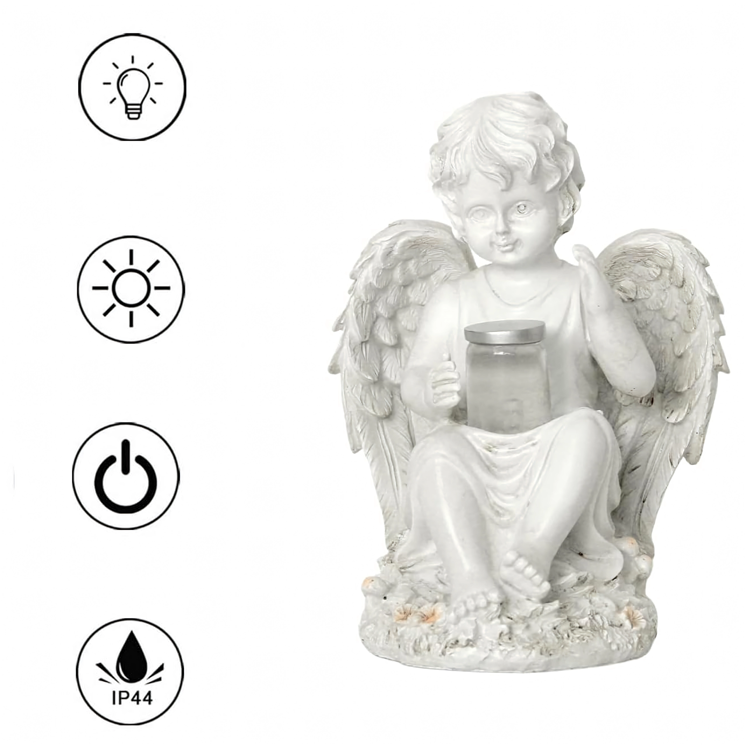 Čarobna dekoracija za vaš zunanjI prostor: sončna angelska figurica iz trpežne smole, ki podnevi krasi in ponoči nežno sveti. Idealna za vrt, teraso in kot simbolična lučka spomina. Sončno napajanje, topla LED svetloba in odporna na vremenske vplive zagotavljajo brezskrbno uporabo in dolgo življenjsko dobo.