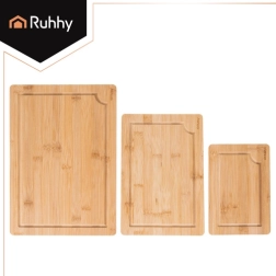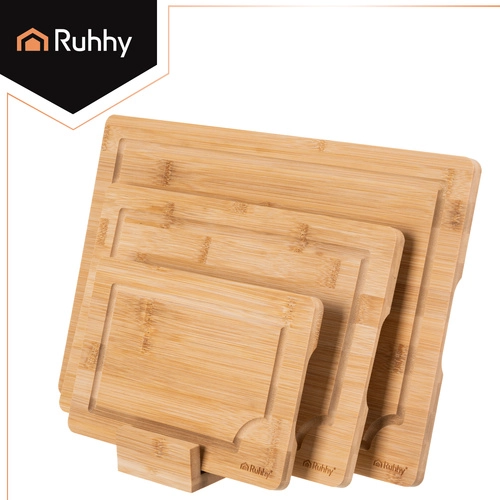 Praktičen komplet treh bambusovih desk RUHHY v različnih velikostih s trdnim stojalom za pregledno shranjevanje. Naravni bambus je vzdržljiv in higienski, nežen do rezil nožev in hitro se suši. Vgrajeni kanalčki za odtekanje soka pomagajo ohranjati red pri rezanju mesa, zelenjave in sadja. Idealno za vsako kuhinjo za rezanje in serviranje.