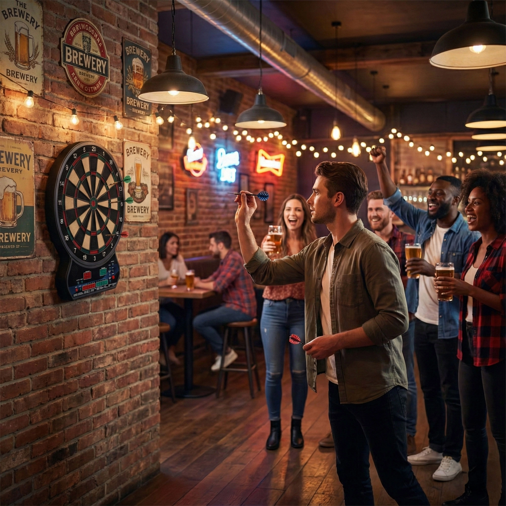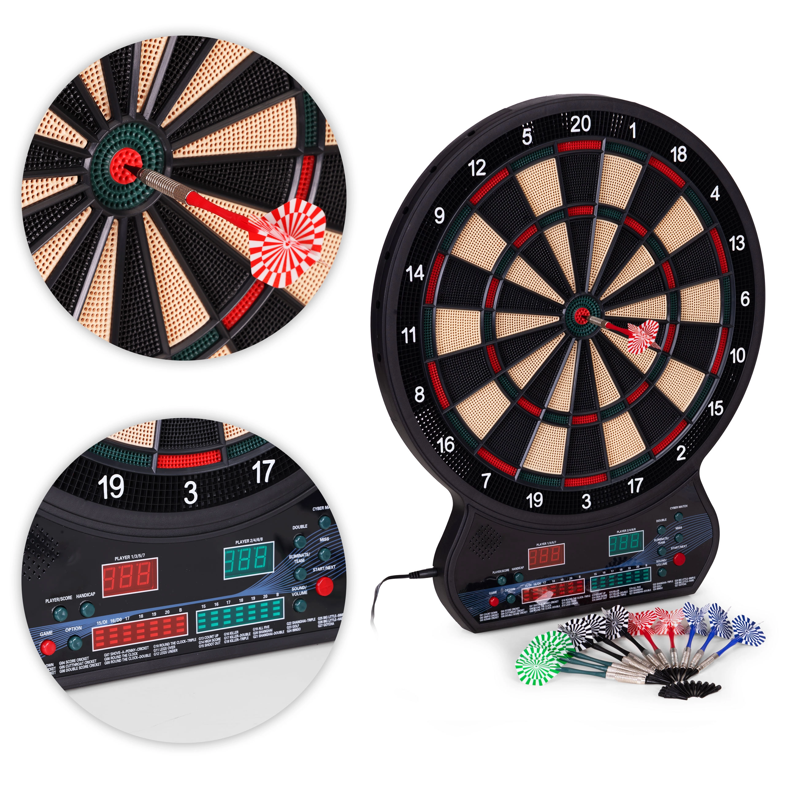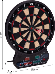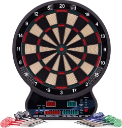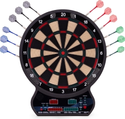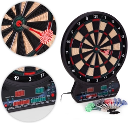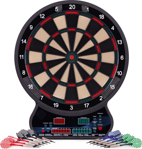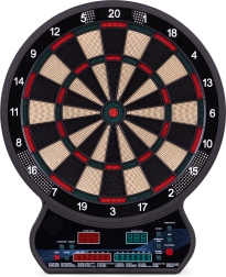 Vnesite v dom, pisarno ali igralni kotiček odmerek zabave in tekmovalnosti. Ta elektronski tarč za pikado združuje natančno zaznavanje zadetkov, intuitivno upravljanje in širok izbor igralnih načinov. Zahvaljujoč dvema LCD-zaslonoma imate pregled nad rezultati in aktivnim igralcem, medtem ko glasovna navodila zagotavljajo tekoč potek igre.