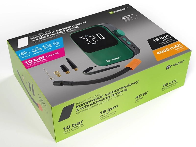 Iščete zanesljiv kompresor za na pot? Kompresor TRACER združuje visoko zmogljivost, enostavno upravljanje in praktične funkcije v eni kompaktni napravi. Zahvaljujoč najv. tlaku 10 bar in pretoku 18 l/min boste hitro dopolnili tlak v avtomobilskih ali kolesarskih pnevmatikah, športni opremi in napihljivih dodatkih.