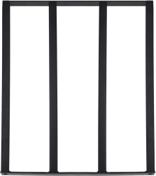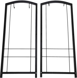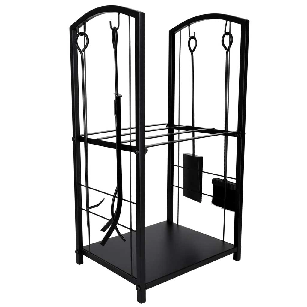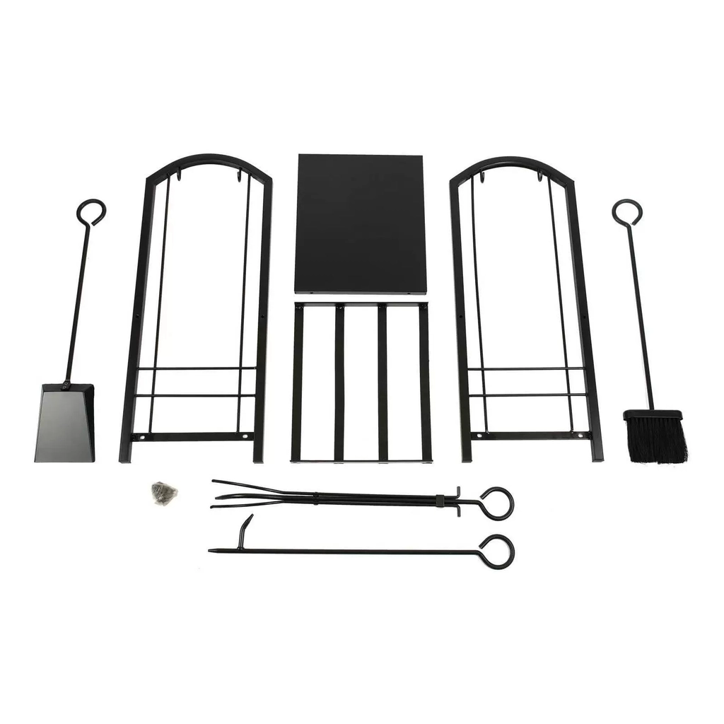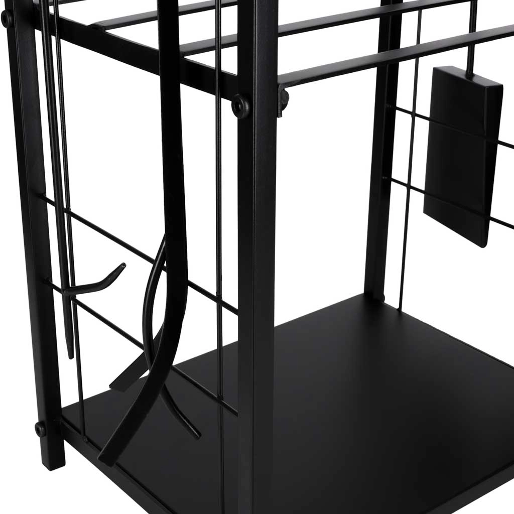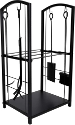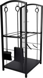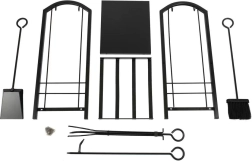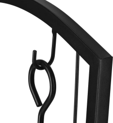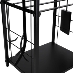 Na stranskih kljukicah visi celotno kaminsko orodje – mehur, klešče, lopatko in ščetko –, zato sta upravljanje kurišča in čiščenje pepela hitra in udobna. Odprta konstrukcija z lokastimi stranicami deluje lahkotno in elegantno ter se prilega tako modernim kot rustikalnim interierjem.