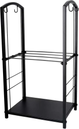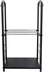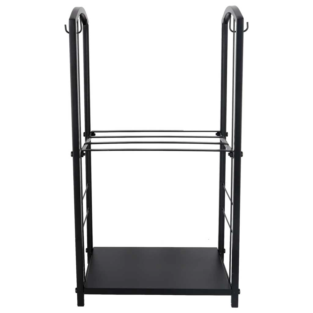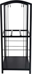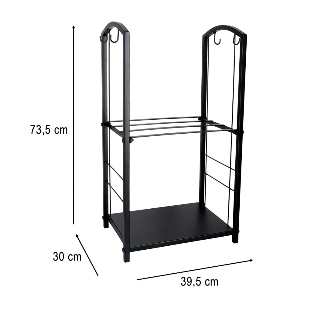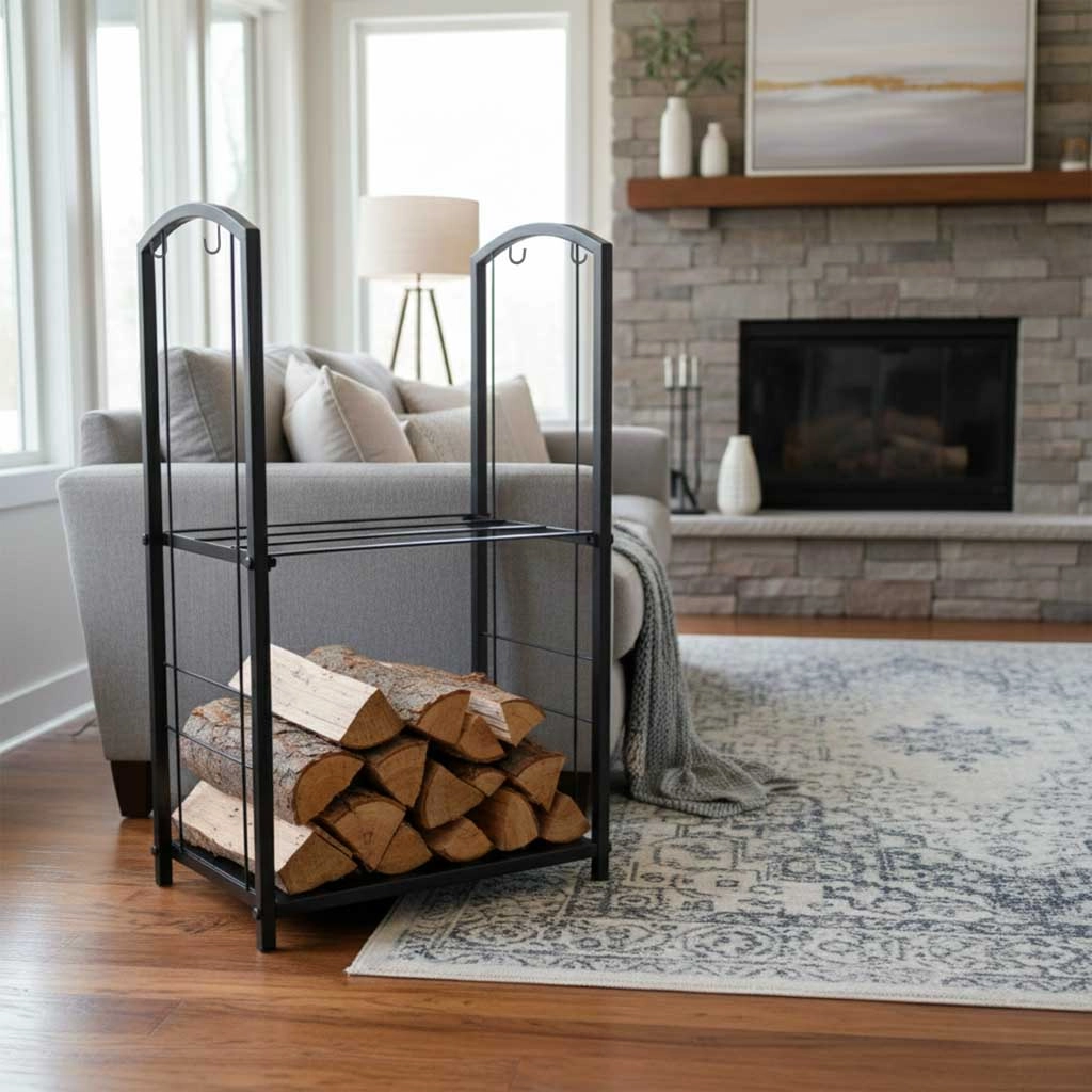 To kompaktno stojalo spremeni shranjevanje kurilnega lesa v dizajnerski element interierja. Robustni okvir iz kovanega železa s praškastim lakom je odporen proti praskam in dobro prenaša vsakodnevno uporabo. Spodnja polna polica ščiti tla pred nečistočami, zgornja zračna polica ohranja polena suha in pregledno shranjena.