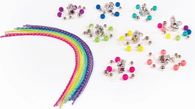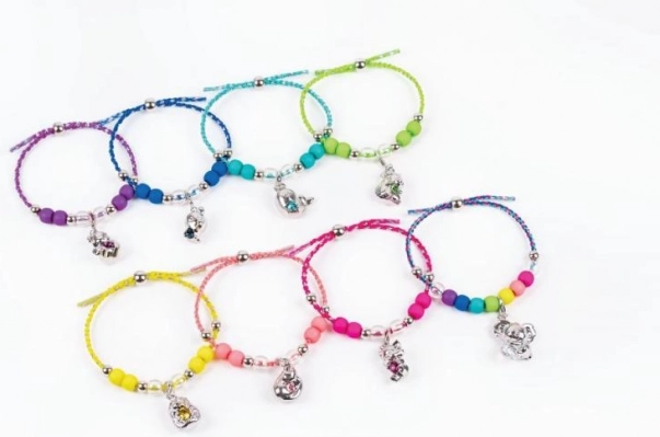Vsebuje pleteno vrvico v barvi lika in 11 barvnih kroglic. Enostavno nizanje, udobno nošenje in nastavljiva velikost za otroška zapestja.