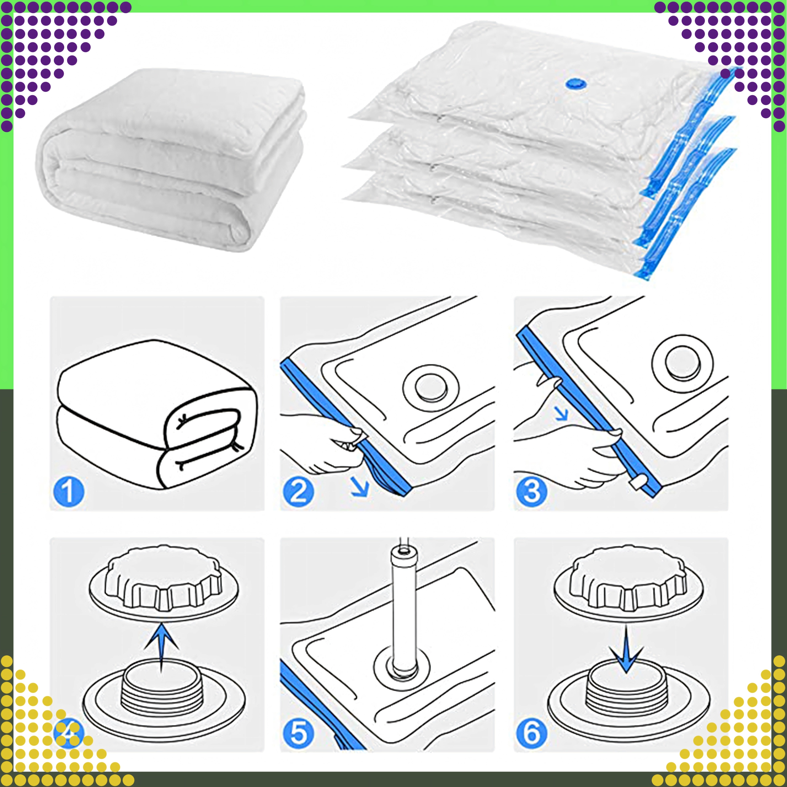Prihranite prostor in zaščitite svoje tkanine s praktično vakuumsko vrečo velikosti 50 × 70 cm. Zahvaljujoč hermetičnemu zapiranju, ventilu za izsesavanje zraka in vzdržljivi dvojni zadrgi bodo vaša oblačila, odeje in blazine čista, suha in brez vonjav. Idealno za sezonsko shranjevanje, prihrani do 4× več prostora in je ponovno uporabna.