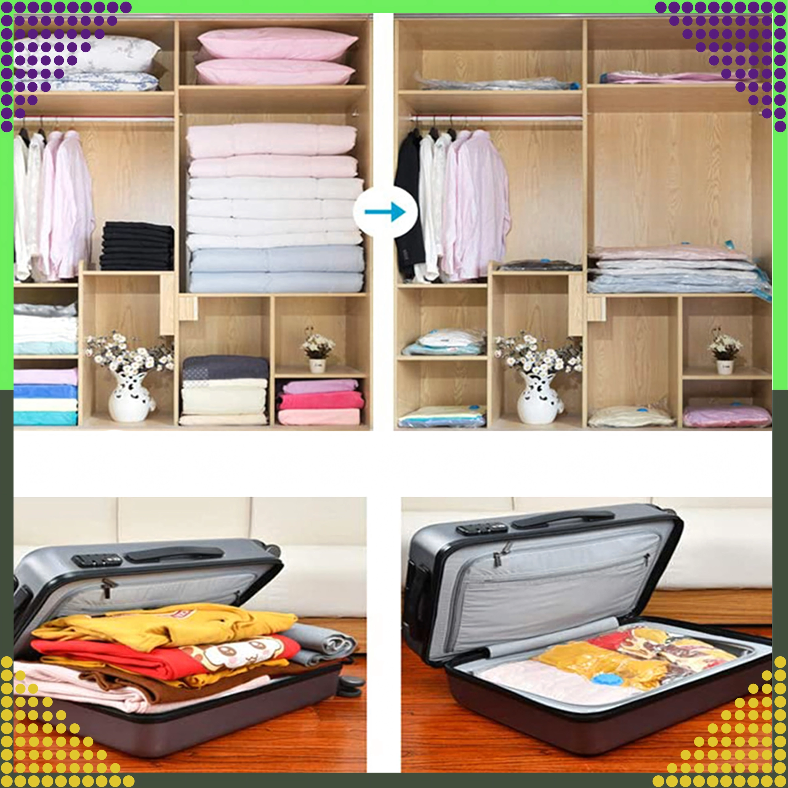 Stisnite voluminozne tkanine in pridobite več prostora v omari ali kovčku. Idealno za odeje, puloverje in zimske jakne.