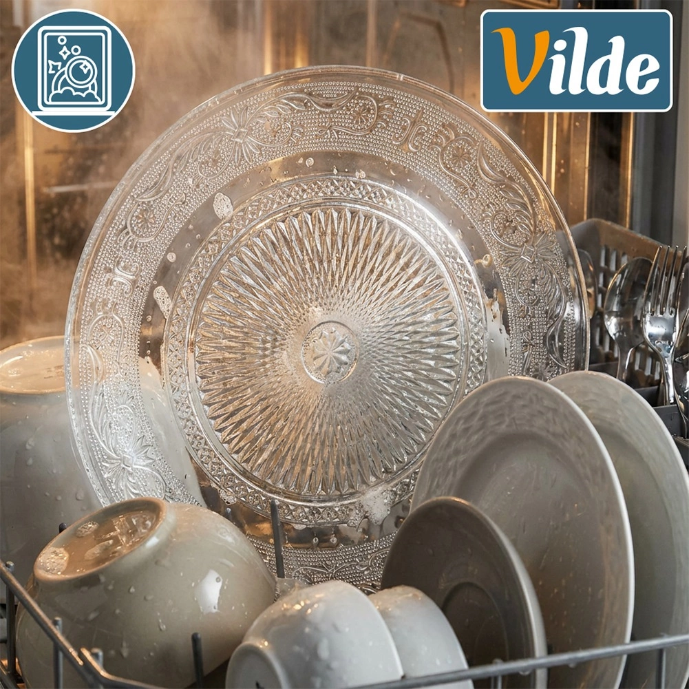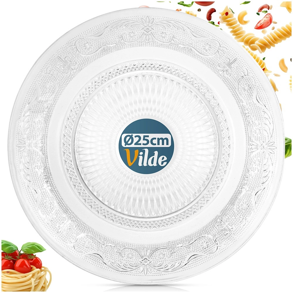 Eleganten stekleni krožnik s premerom 25 cm z reliefnim okrasjem, ki spominja na kristal. Vsestranski in praktičen za vsakodnevno obedovanje in praznično serviranje. Uporaben kot plitvi krožnik ali kot pladenj za sladice in prigrizke. Primeren za pomivalni stroj, kakovostno prozorno steklo, klasičen dizajn in univerzalna uporaba v gospodinjstvu in gastronomiji.