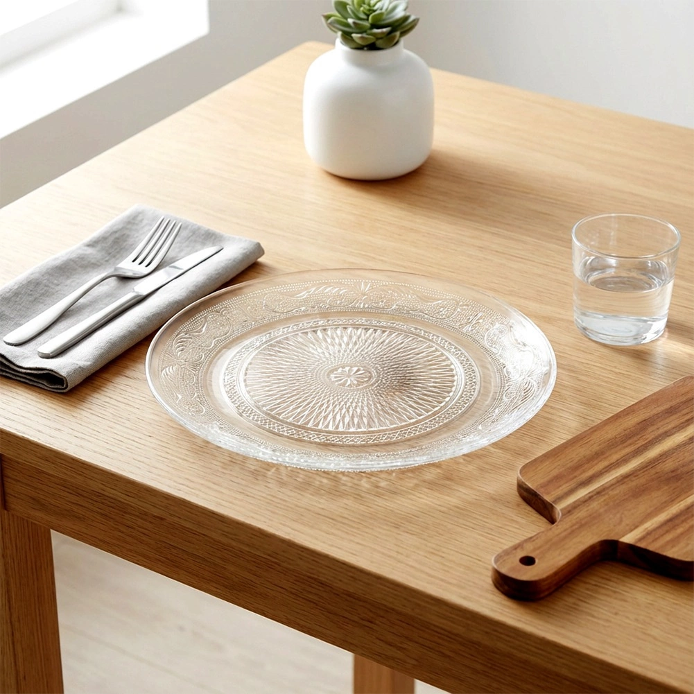 Odkrijte stilski stekleni krožnik s premerom 25 cm in višino 2 cm, ki združuje praktičnost in estetiko. Zaradi učinkovitega reliefnega okrasja deluje kot kristal in lepo dopolni vsak pogrinjek. Idealen je za serviranje glavnih jedi, sladkih sladic in slanih dobrot.