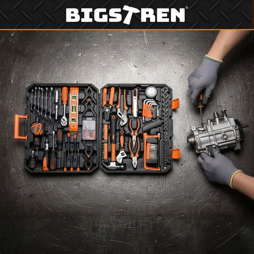 Praktičen set orodja BIGSTREN v trdnem kovčku združuje vse, kar najpogosteje potrebujete doma in v delavnici. Vsebuje 168 kosovključe, nasadne glave, bite, izvijače, klešče in dodatke – vsak kos ima svoje mesto zahvaljujoč preglednemu vložku. Ne manjka raglja 3/8” z 72 zobmi za tekoče zategovanje, magnetne konice za zanesljivo delo ter vzdržljivi deli iz krom-vanadijevega jekla (CrV).