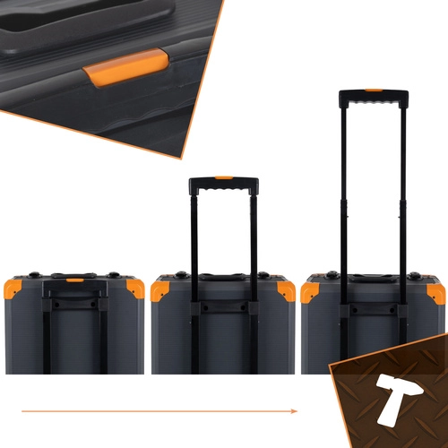 Robusten aluminijast kovček z nastavljivim ročajem, kolesi in ojačanimi vogali zagotavlja udoben in varen prevoz celotnega seta, doma, v garaži ali na poti.