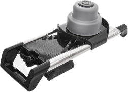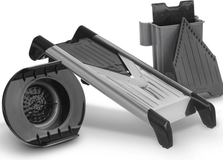 Za varnost skrbita zaščitno držalo/potisnik, ki ščiti prste, in nedrseče zložljive nogice za stabilen naklon. Zamenljive vložke pospravite v praktičen zabojček, zato so vedno pri roki in hkrati zaščiteni. Ohišje je iz trpežne plastike v sivi in črni barvi, vzdrževanje pa olajša možnost pomivanja v pomivalnem stroju.
