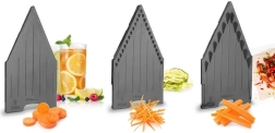 Set vključuje tri zamenljive vložke z različnim profilom za tanko rezanje in rezanje na trakove – idealno za solate, zelenjavne rezance in pomfrit.