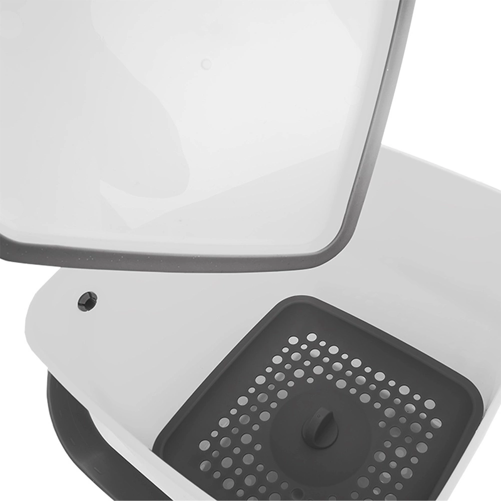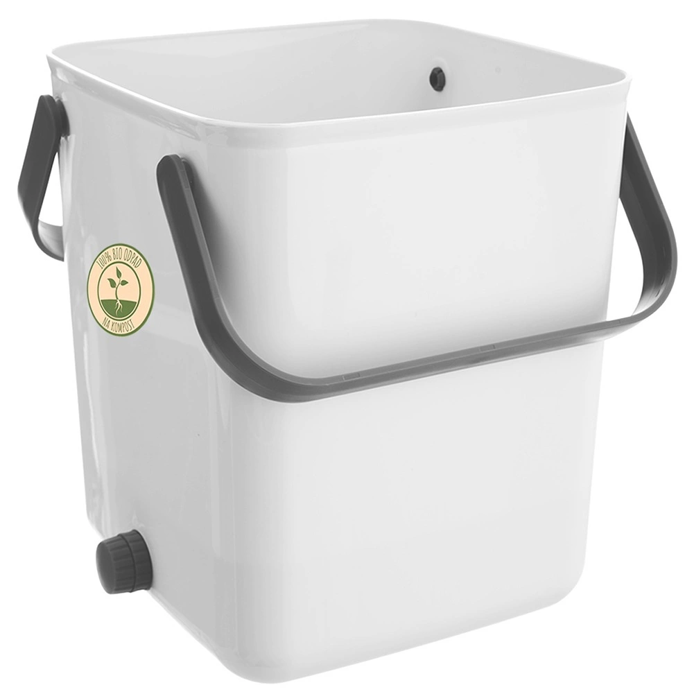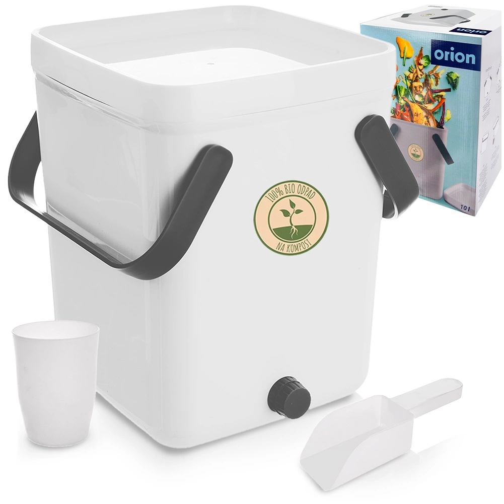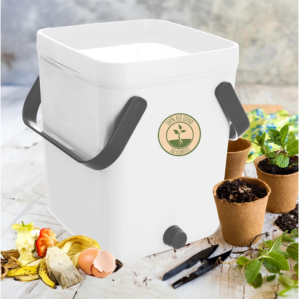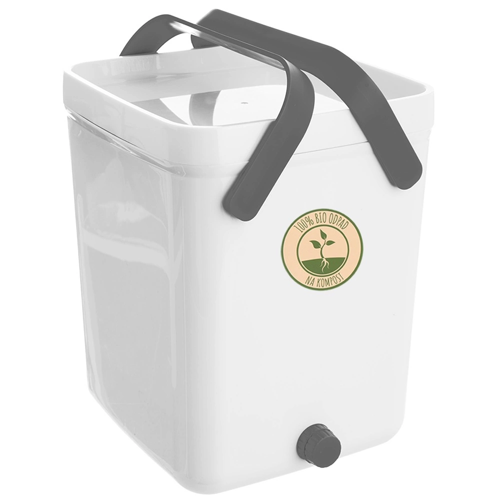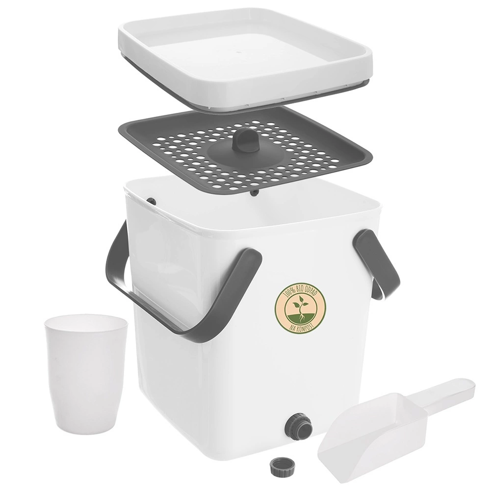Tesen pokrov s kakovostnim tesnilom zagotavlja čisto in varno uporabo v kuhinji. Kompostnik je izdelan iz trpežne plastike (belo ohišje, sivi ročaji) in ima zložljive ročaje za enostavno prenašanje. Del seta je mrežica za ločevanje tekočine, merilni lonček in lopatka.