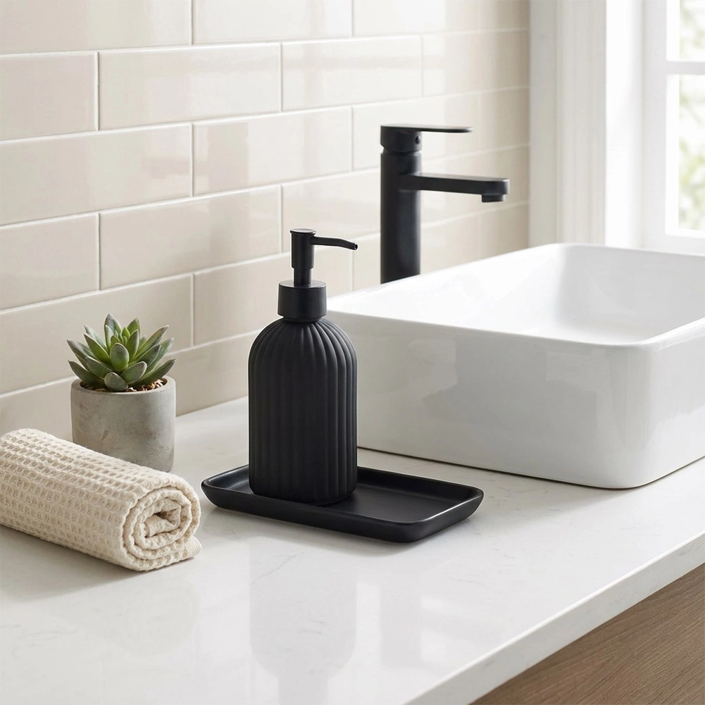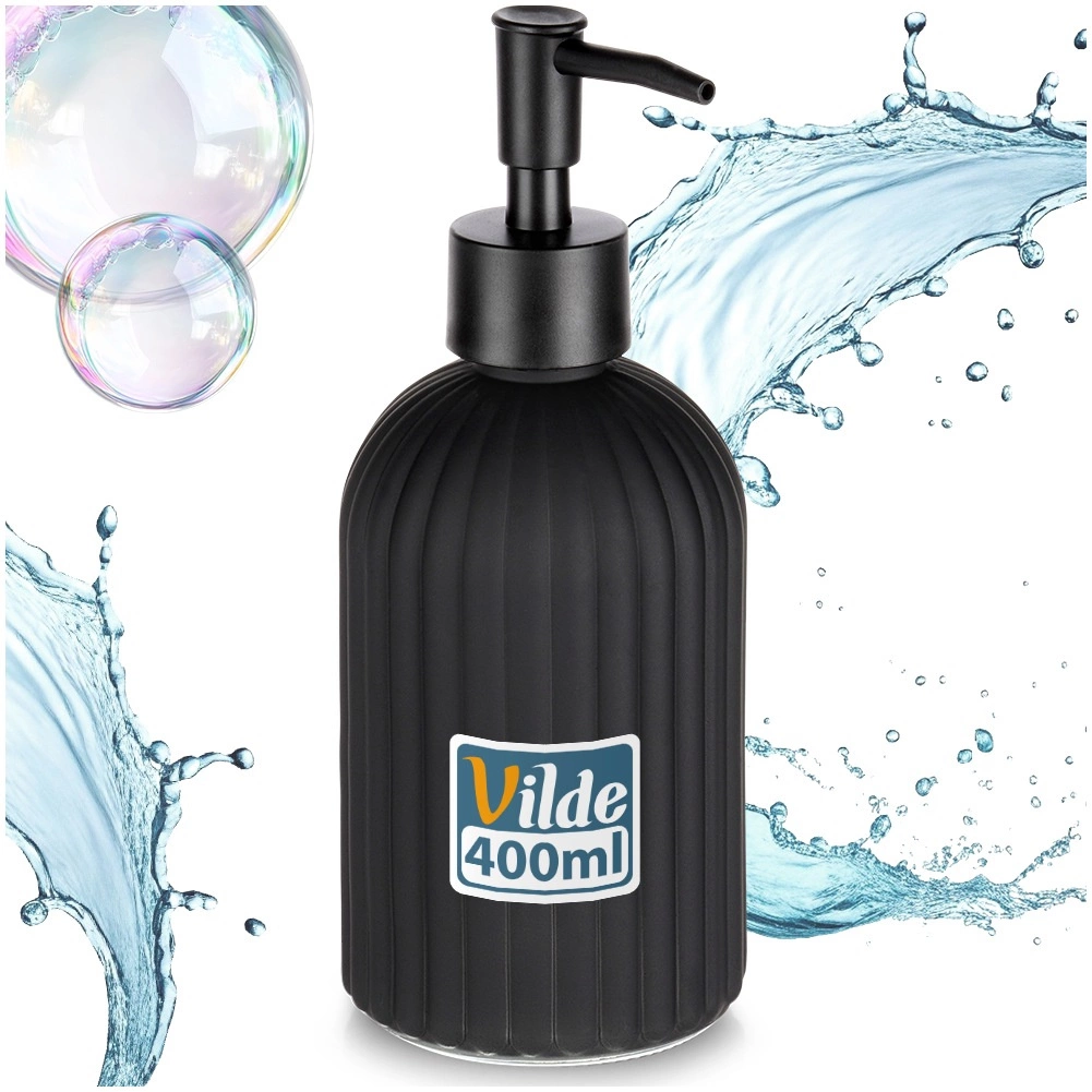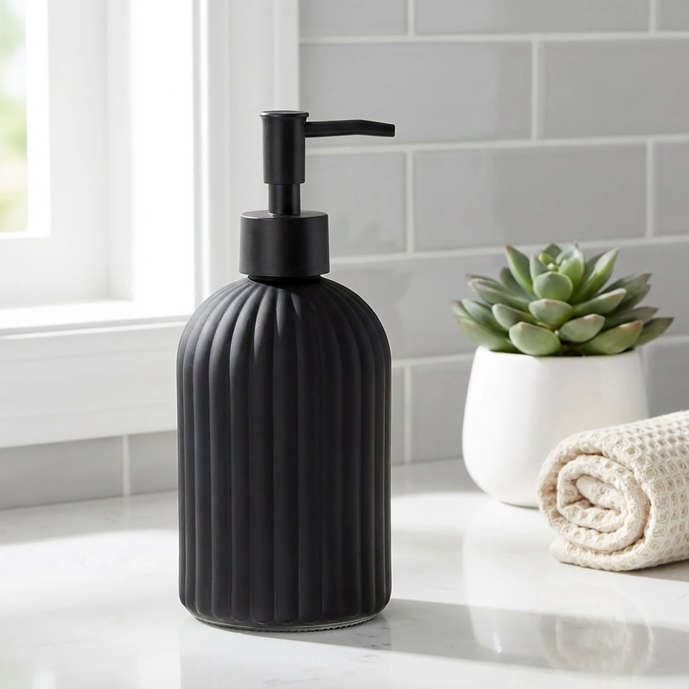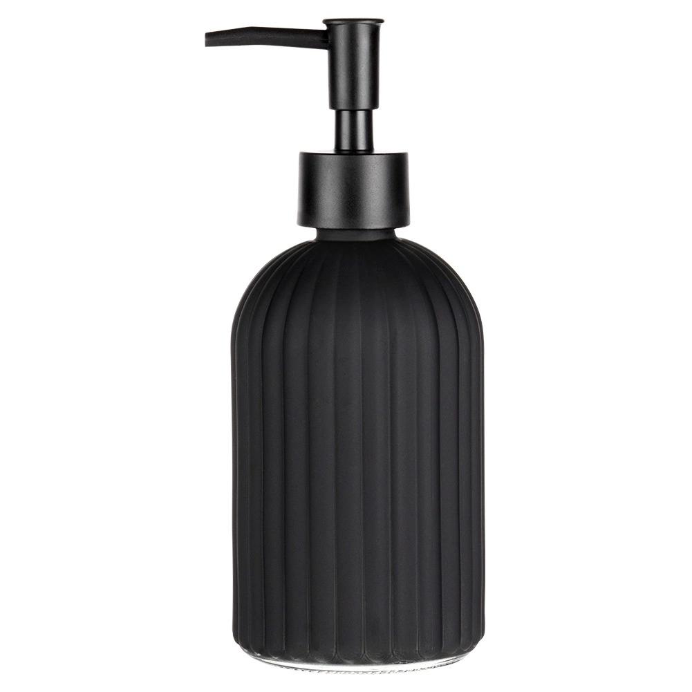 Stilski dozirnik mila iz kakovostnega stekla v mat črni barvi je praktičen in dekorativen dodatek za vašo kopalnico ali kuhinjo. Teksturirana, rebrasta površina zagotavlja zanesljiv oprijem in vzdržljivost, medtem ko čiste linije poudarijo moderen videz interierja.