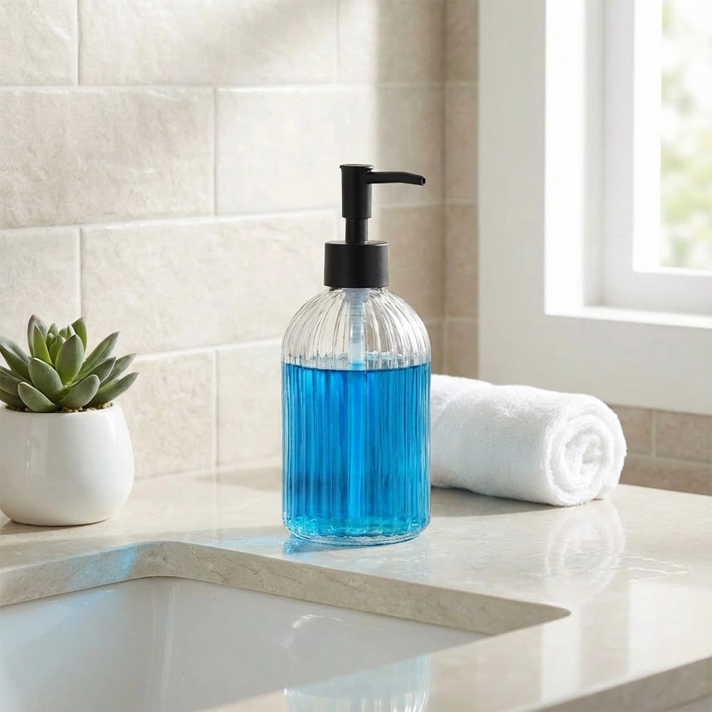 Stilski in praktični dozirnik iz čistega rebrastega stekla prinaša red in estetiko v vsakdanjo rutino. Zahvaljujoč prosojnemu telesu imate takojšen pregled nad količino vsebine, medtem ko kakovostna črna pumpica omogoča natančno in kontrolirano doziranje. Prostornina 400 ml je idealna za tekoče milo, gel za roke in sredstvo za pomivanje posode.