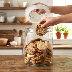 Pokrov s prozornim tesnilom zagotavlja zanesljivo tesnjenje, zato živila ne navlažijo in ne izgubijo arome – idealno za kavo, čaj in piškote.