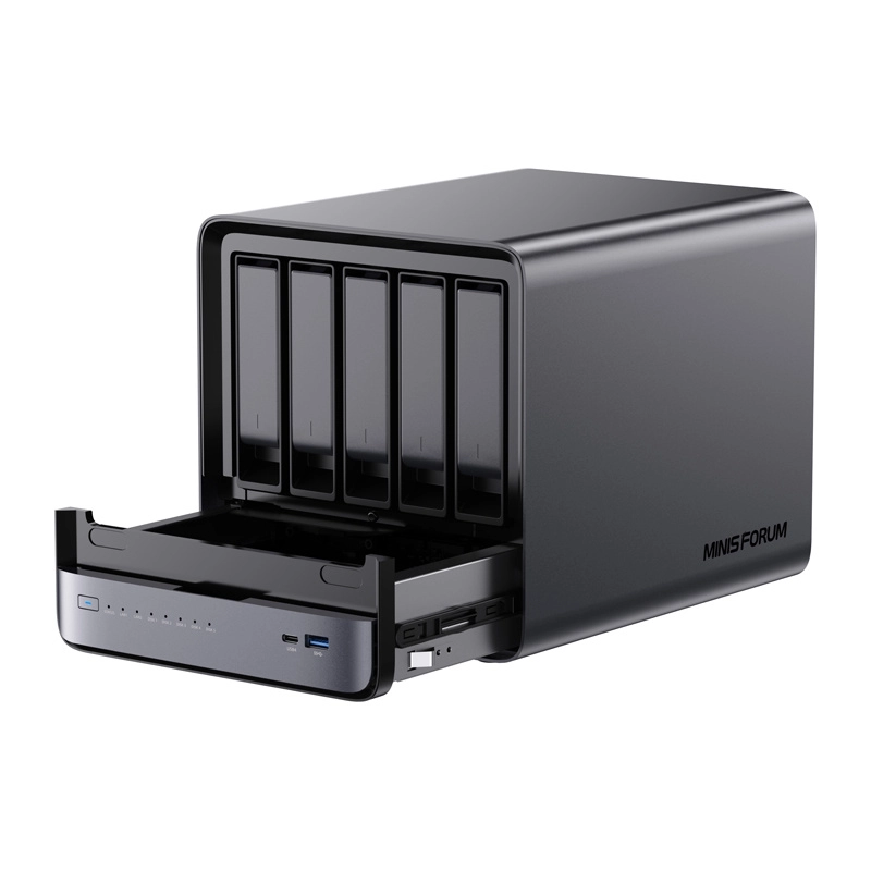 Kompaktni MINISFORUM NAS N5 združuje zmogljivost mini računalnika in prilagodljivost NAS. Ponuja 8-jedrni AMD Ryzen 7 z grafiko Radeon 780M, do 96 GB DDR5, prostor za do 8 pogonov s kapaciteto do 144 TB, hit omrežje 10 GbE + 5 GbE, sodobno povezljivost USB4 in HDMI 2.1 ter razširitve prek PCIe x16 in OCuLink. Sistem MinisCloud OS zagotavlja enostavno upravljanje, ZFS posnetke in varen oddaljen dostop.