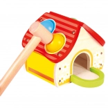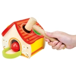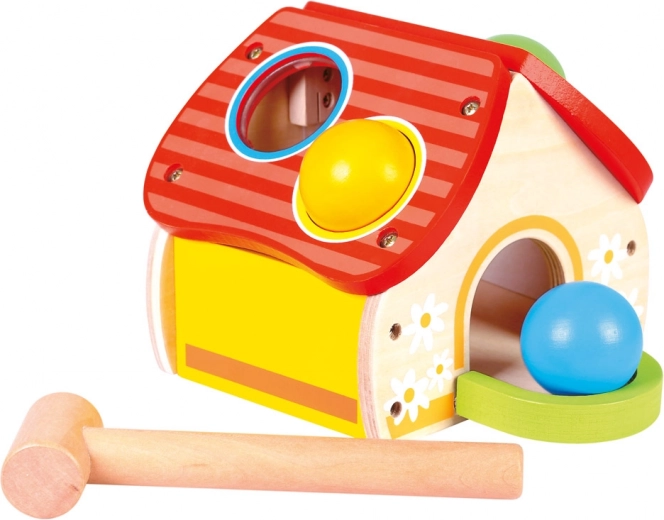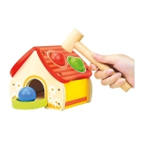 Ta kakovostna lesena igrača v podobi vesele hišice pritegne otroke z živahnimi barvami in preprostim principom igre – žogice se vstavljajo v odprtine na strehi in se z lahkimi udarci s kladivcem nežno zabijajo. Zabava spodbuja razvoj motorike, potrpežljivost in natančnost.