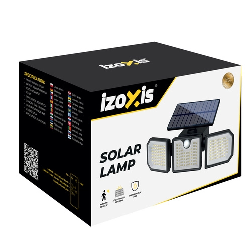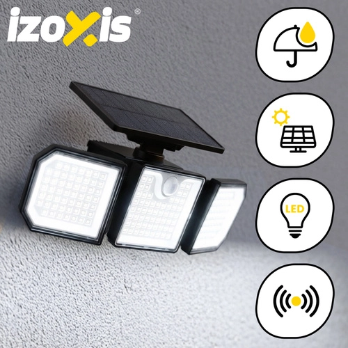 Zmogljiva solarna svetilka IZOXIS s 167 LED in svetilnostjo 500 lm zanesljivo osvetli vrt, vhod, fasado in dovoz. Zahvaljujoč solarnemu panelu 5,5 V / 1,5 W in bateriji 1800 mAh se čez dan polni, po temi pa sveti samodejno. Senzor gibanja, senzor mraka in 3 načini zagotovijo svetlobo le takrat, ko je potrebna. Odpornost IP65 in stranski reflektorji zagotavljajo širok doseg in dolgo življenjsko dobo brez kablov in stroškov elektrike.