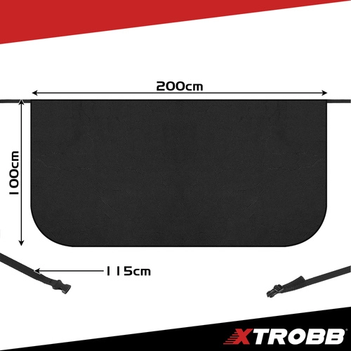 Praktična protimrzna zaščita XTROBB velikosti 200 × 100 cm ščiti vetrobransko steklo pred ledom, snegom in ivjem. Zaradi vodoodpornega in na mraz odpornega materiala se na steklo ne prilepi, hitro jo odstranite brez praskanja in prihranite čas ter zaščitite steklo pred praskami od strgala. Nastavljiv trak s sponko in pritrjevanje preko vrat stabilizirata zaščito tudi v vetru – idealno za SUV, kombije in avtobuse.