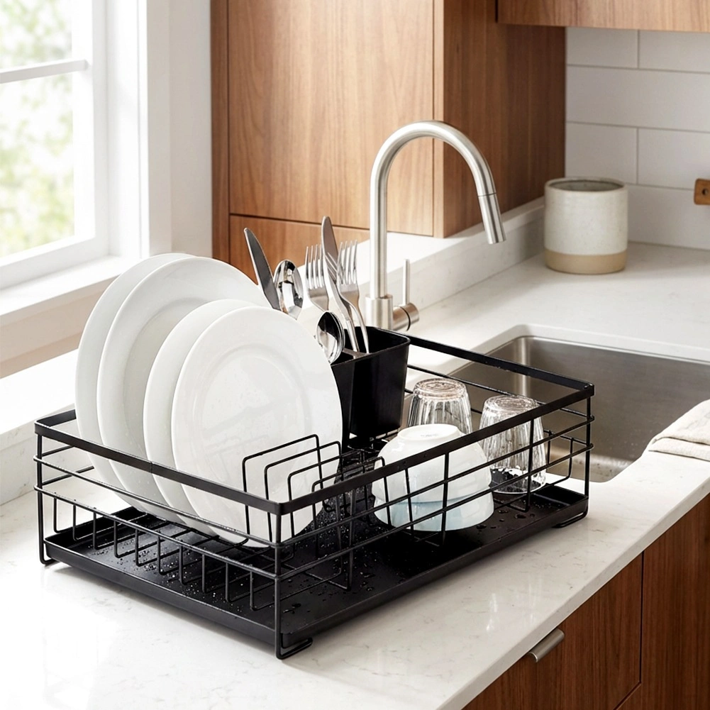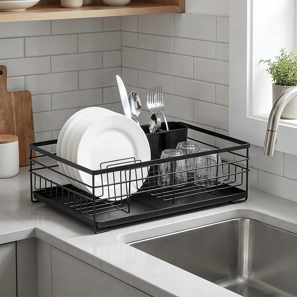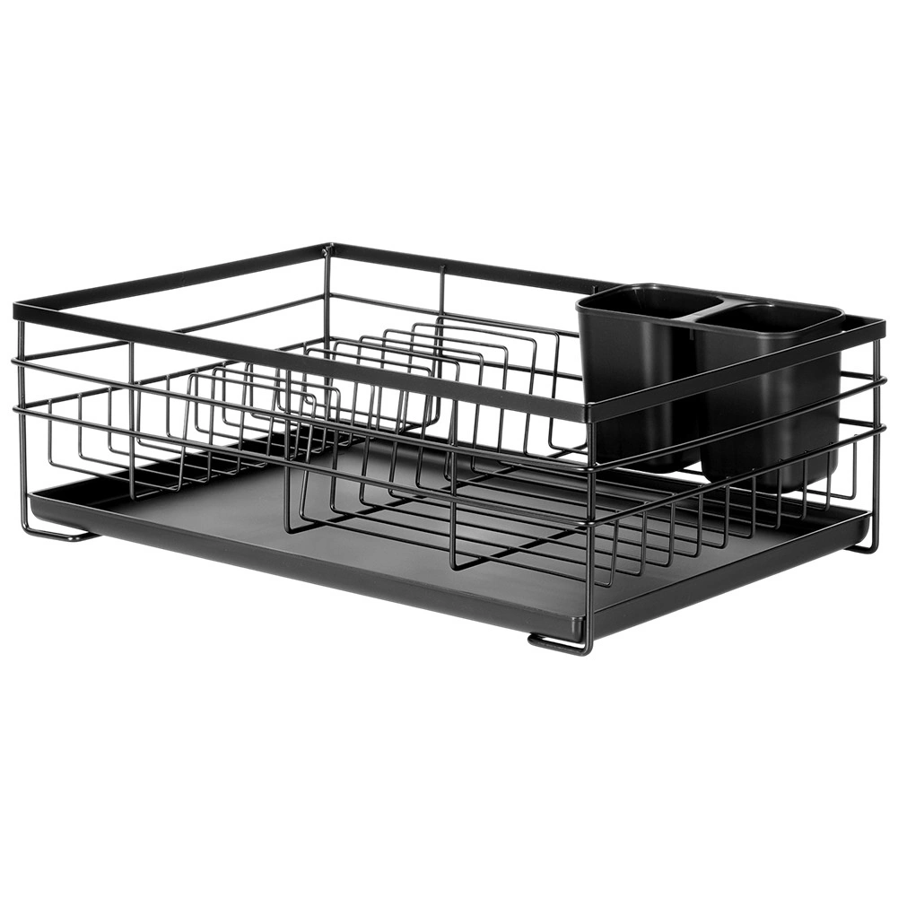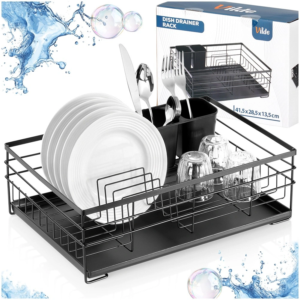 Praktičen in eleganten odcejalnik za posodo v črni barvi za pregledno sušenje krožnikov, kozarcev in pribora. Ponuja veliko kapaciteto, vzdržljivo kovinsko konstrukcijo in odstranljiv odcejalni pladenj, ki ščiti kuhinjski pult pred vodo.
