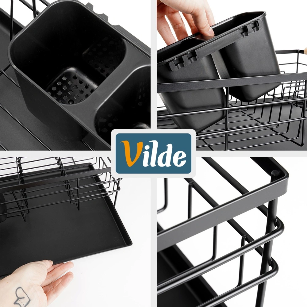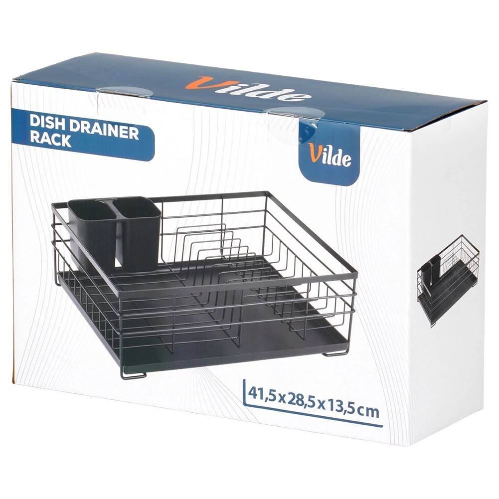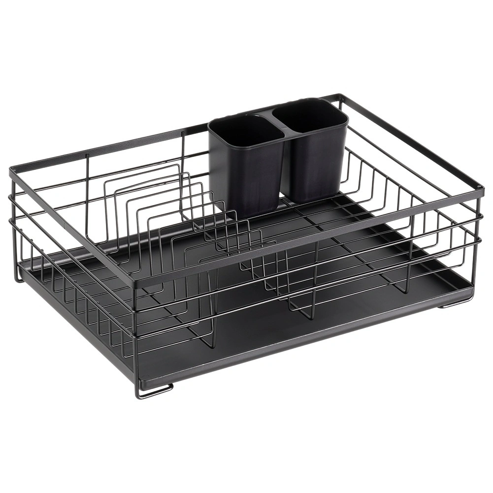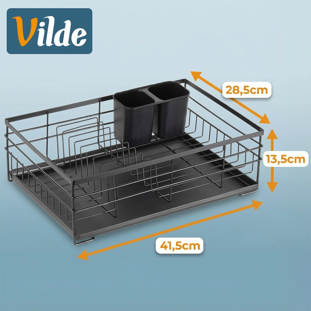 Praktičen in eleganten odcejalnik za posodo v črni barvi za pregledno sušenje krožnikov, kozarcev in pribora. Ponuja veliko kapaciteto, vzdržljivo kovinsko konstrukcijo in odstranljiv odcejalni pladenj, ki ščiti kuhinjski pult pred vodo.