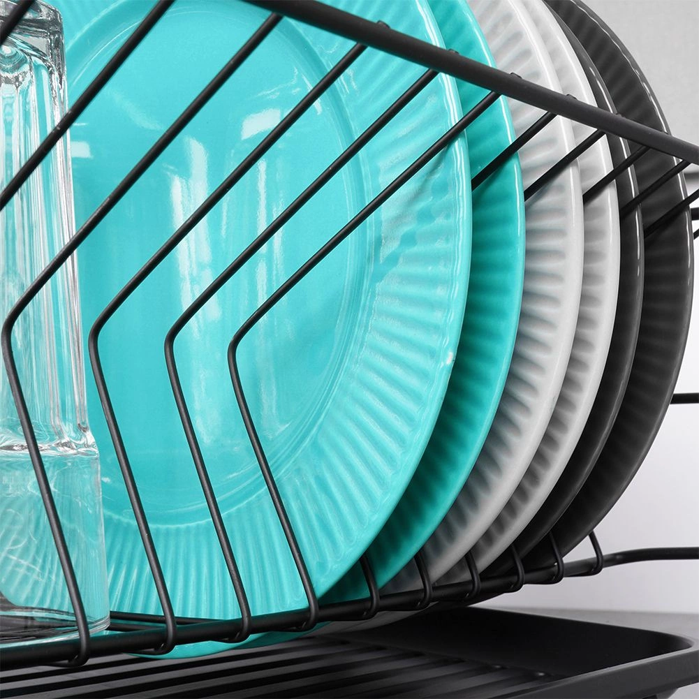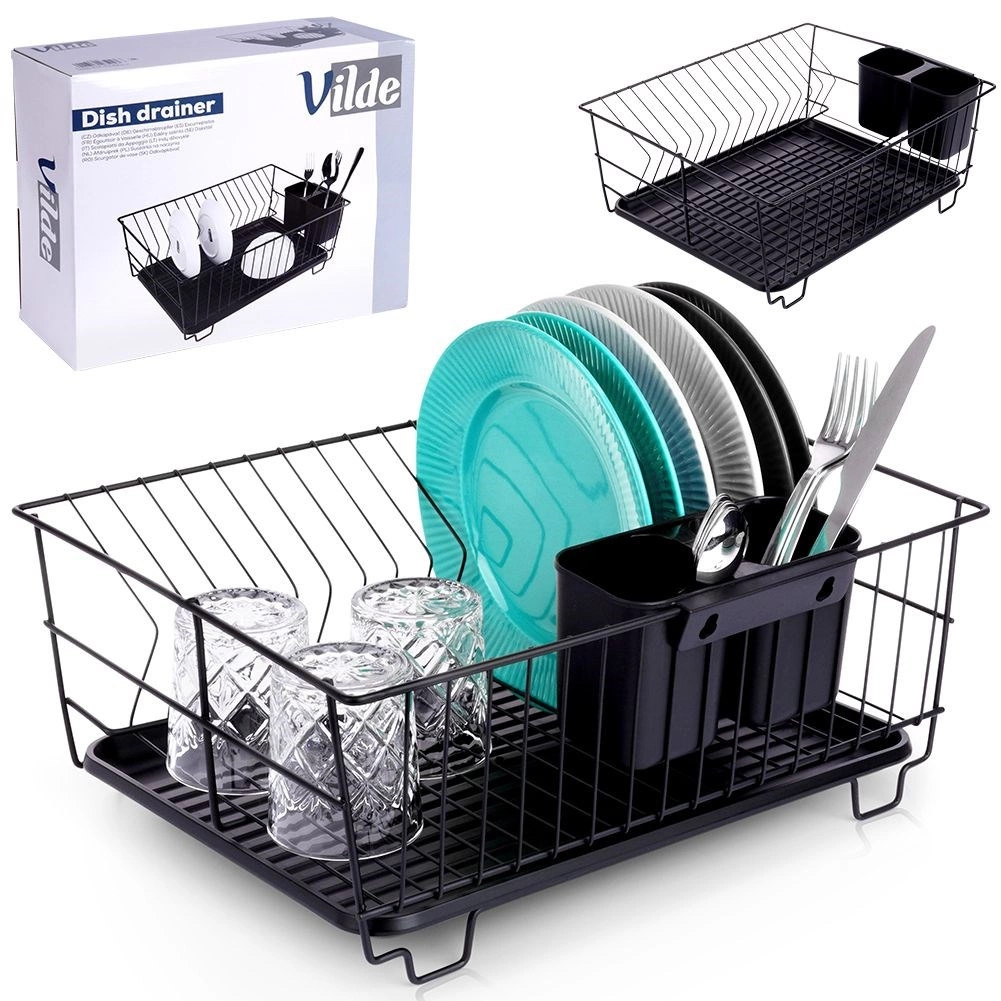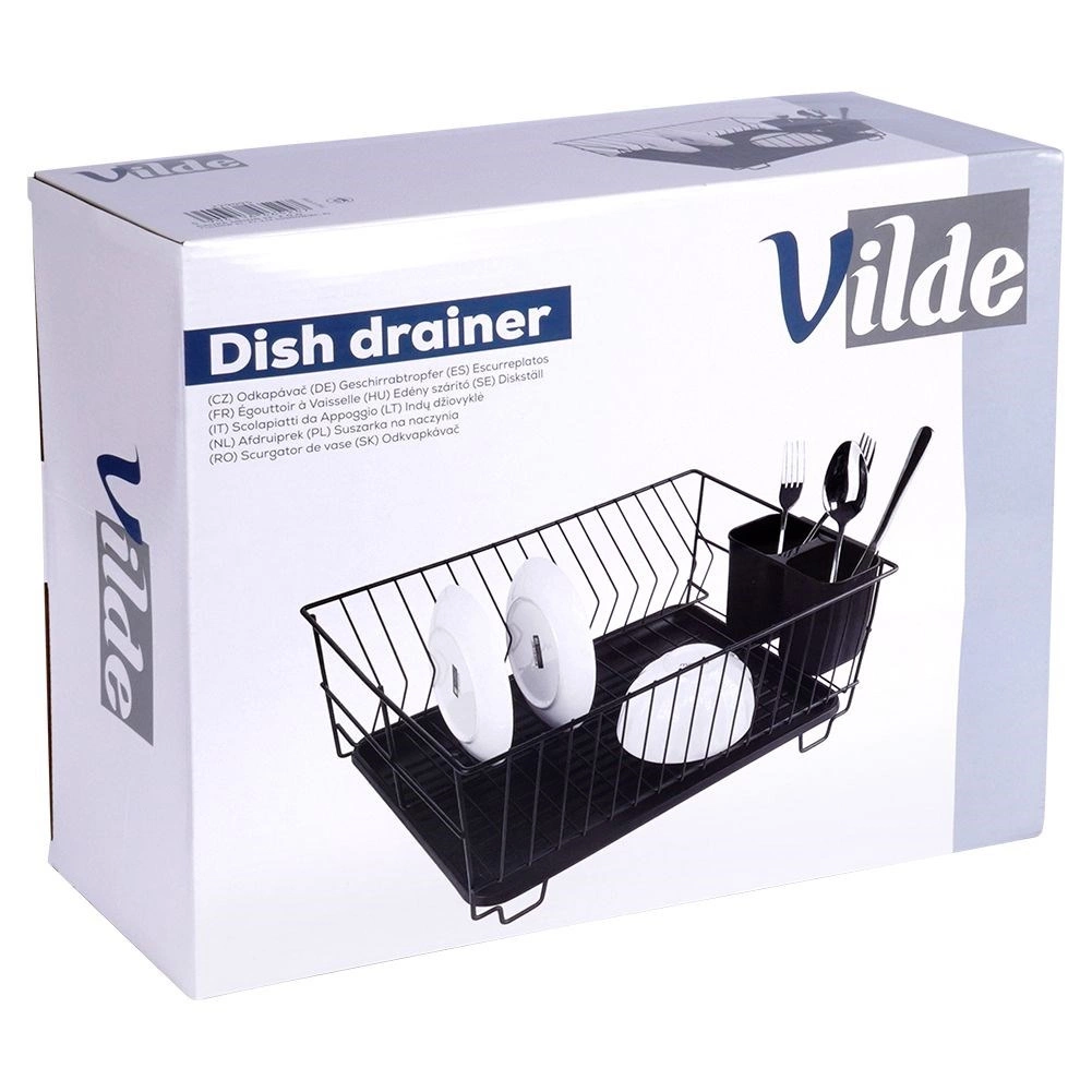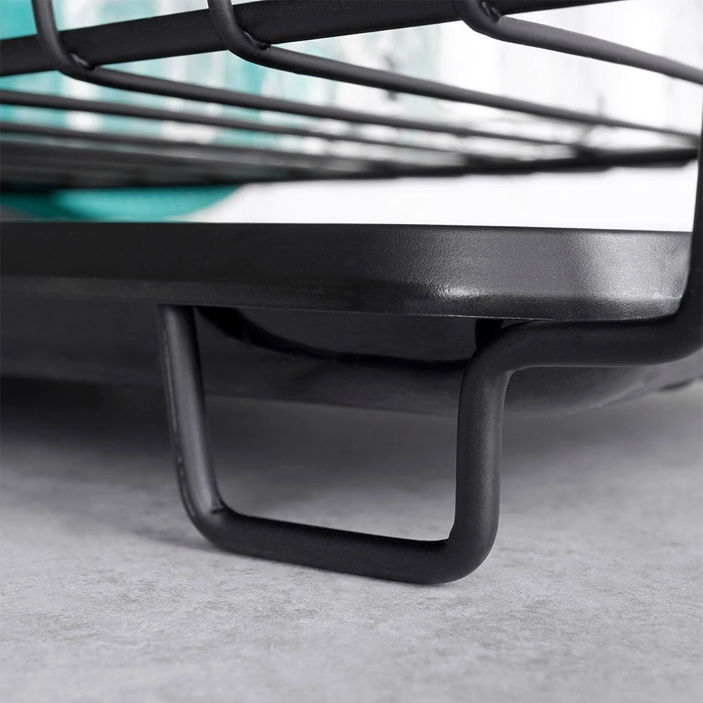 Stilski in funkcionalni odcejalnik za posodo iz trpežne kovine v mat črni barvi združuje moderen loftovski dizajn z vsakodnevno praktičnostjo. Ponuja namenske utore za do 15 krožnikov in dovolj prostora za kozarce, sklede ter večje kose posode. Odstranljiva plastična odcejalna kad zadrži vodo in ohranja delovno površino suho.