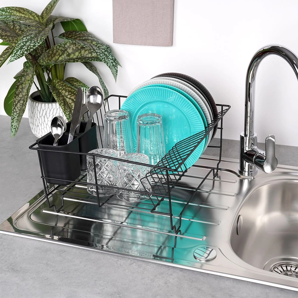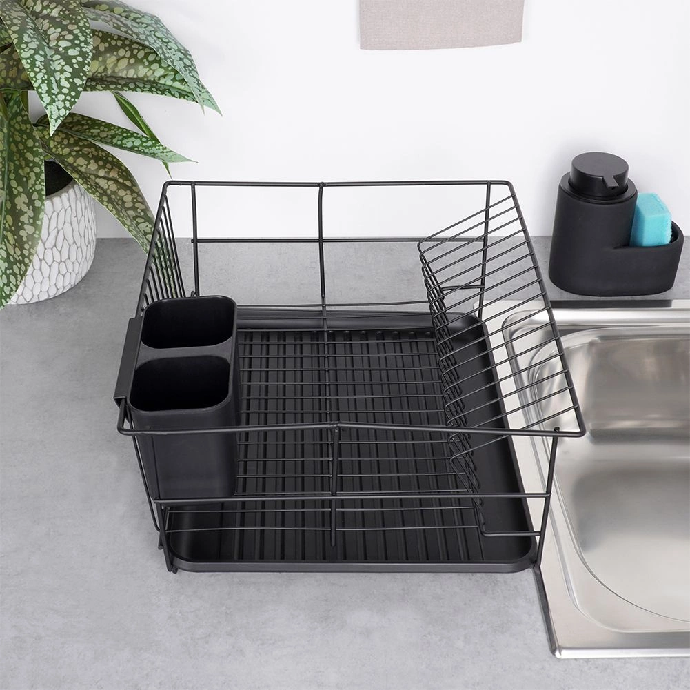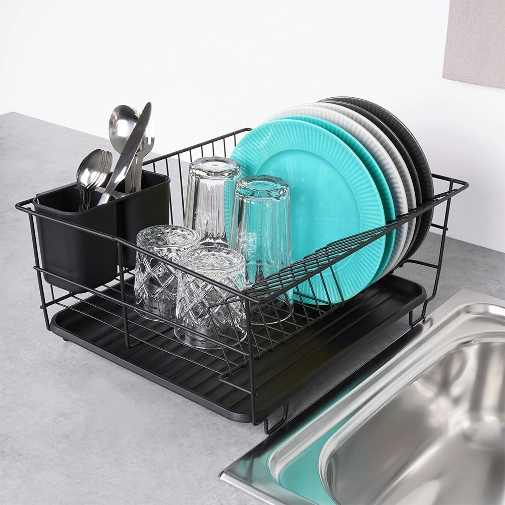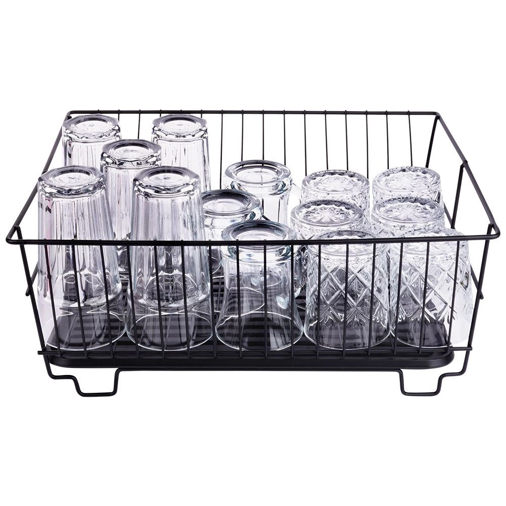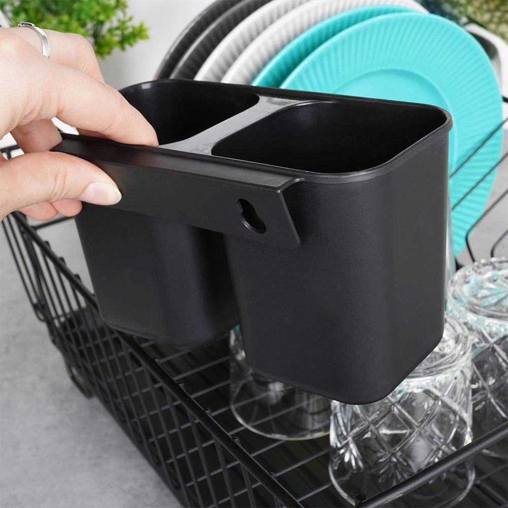 Stilski in funkcionalni odcejalnik za posodo iz trpežne kovine v mat črni barvi združuje moderen loftovski dizajn z vsakodnevno praktičnostjo. Ponuja namenske utore za do 15 krožnikov in dovolj prostora za kozarce, sklede ter večje kose posode. Odstranljiva plastična odcejalna kad zadrži vodo in ohranja delovno površino suho.