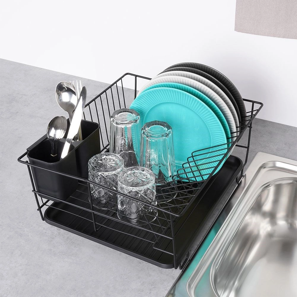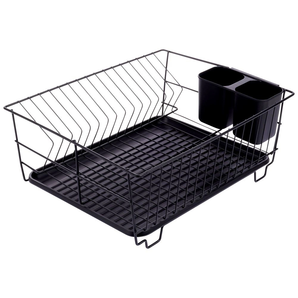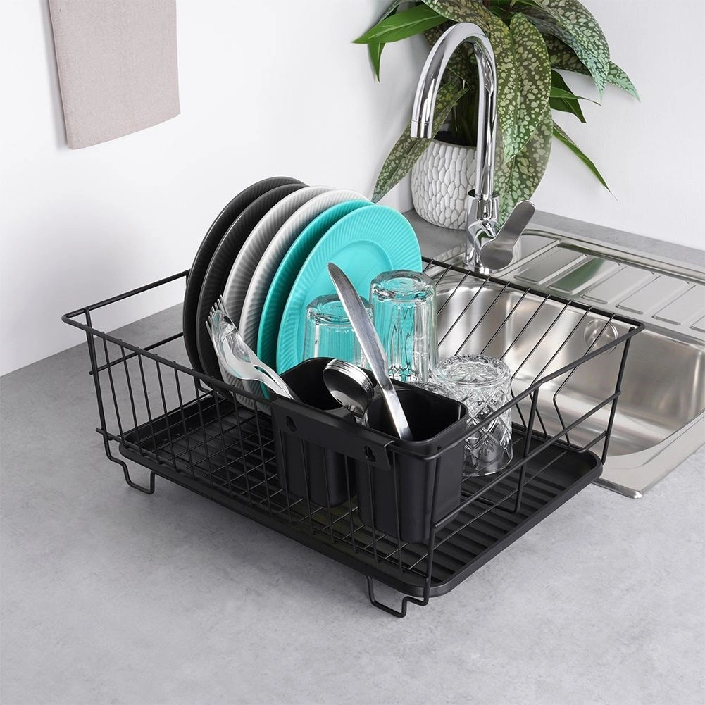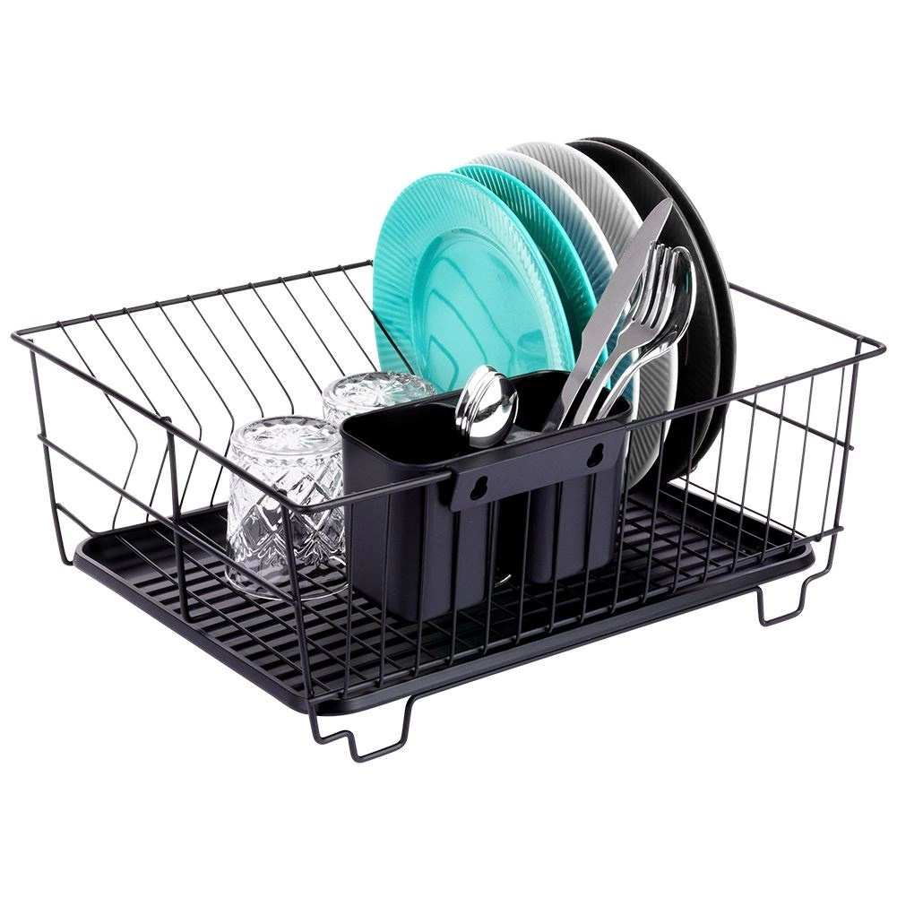 Stilski in funkcionalni odcejalnik za posodo iz trpežne kovine v mat črni barvi združuje moderen loftovski dizajn z vsakodnevno praktičnostjo. Ponuja namenske utore za do 15 krožnikov in dovolj prostora za kozarce, sklede ter večje kose posode. Odstranljiva plastična odcejalna kad zadrži vodo in ohranja delovno površino suho.