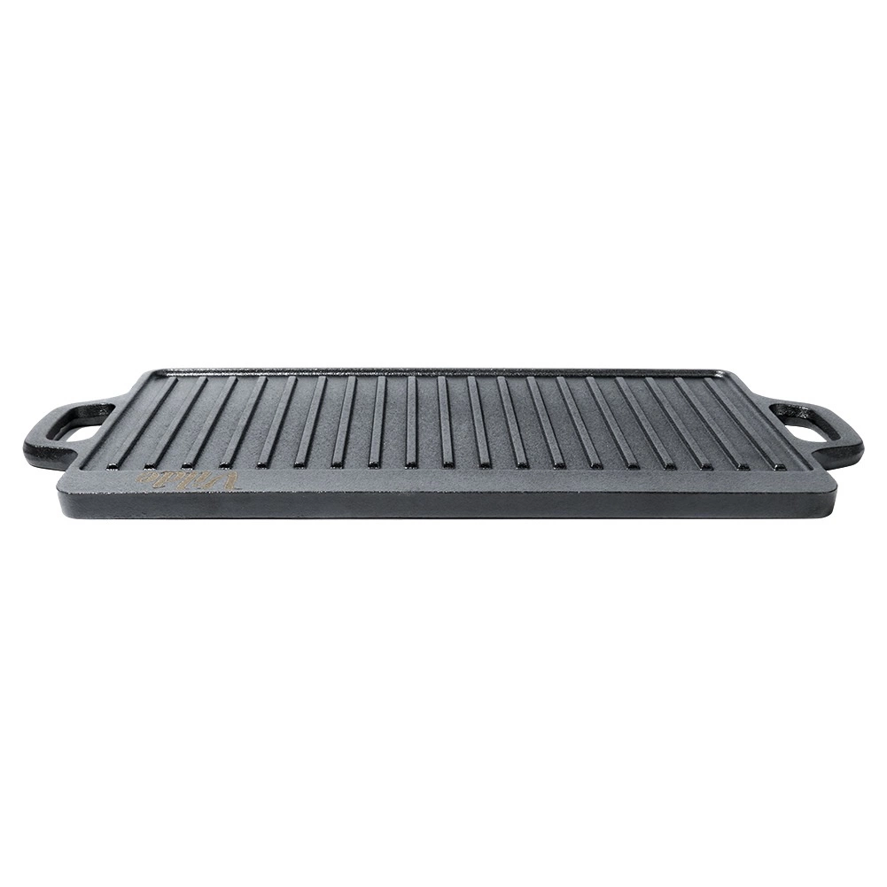 Ta robustna litoželezna plošča je idealna za peko mesa, rib, zelenjave in steakov. Dvostranska zasnova prinaša največjo prilagodljivost: gladka stran za palačinke, jajca ali burgerje in rebrasta stran za izrazit mrežast odtis ter odvajanje maščobe. Zaradi visoke toplotne vztrajnosti litoželezo ohranja stabilno temperaturo in zagotavlja enakomerno pečenje.