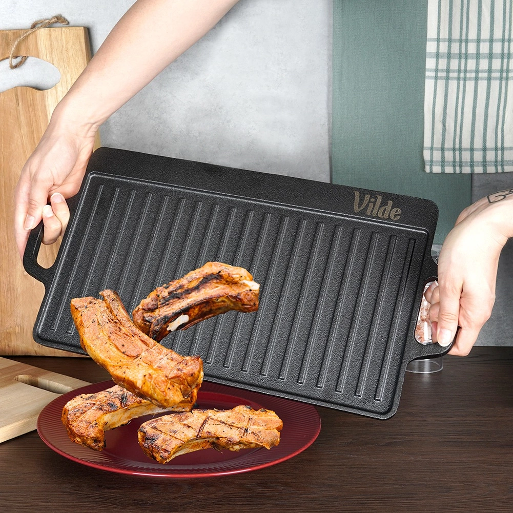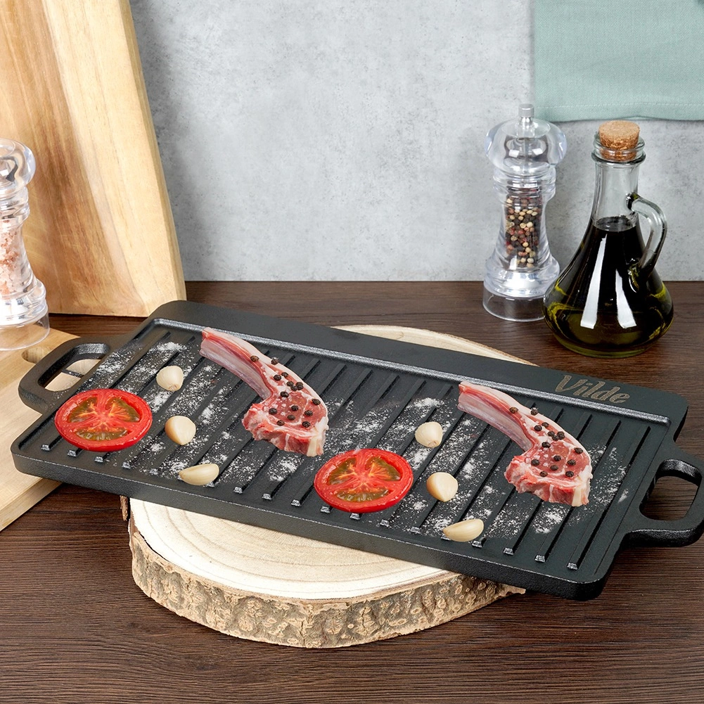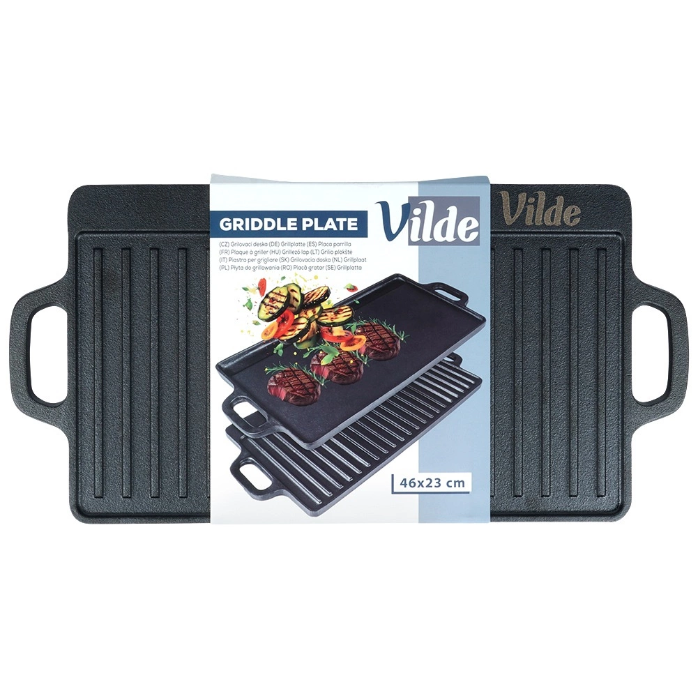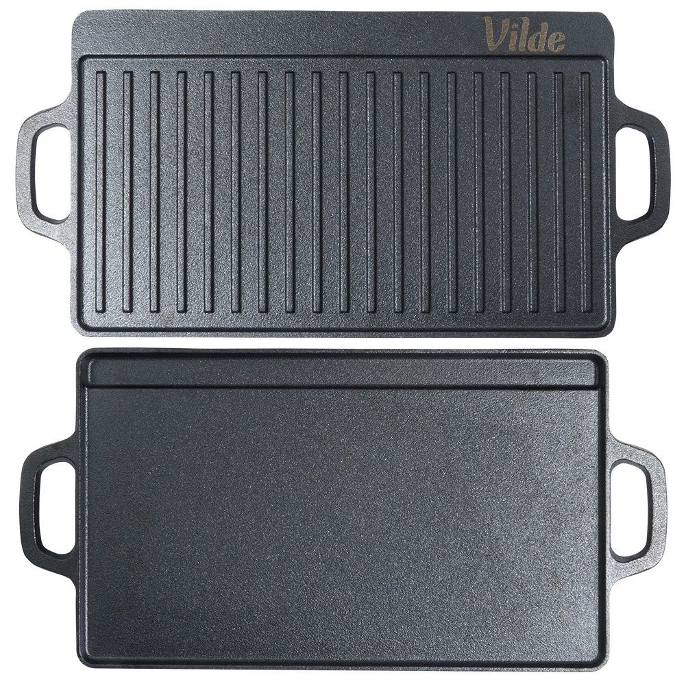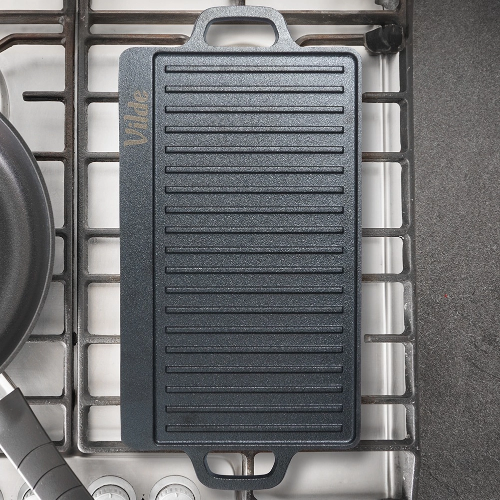 Vzdržljiva dvostranska litoželezna plošča za žar VILDE CAST LINE v dimenzijah 45,5 × 22,5 cm ponuja eno gladko in eno rebrasto površino za vsestransko kuhanje. Litoželezo se enakomerno segreva, odlično zadržuje toploto in je primerno za štedilnik, pečico in žar.