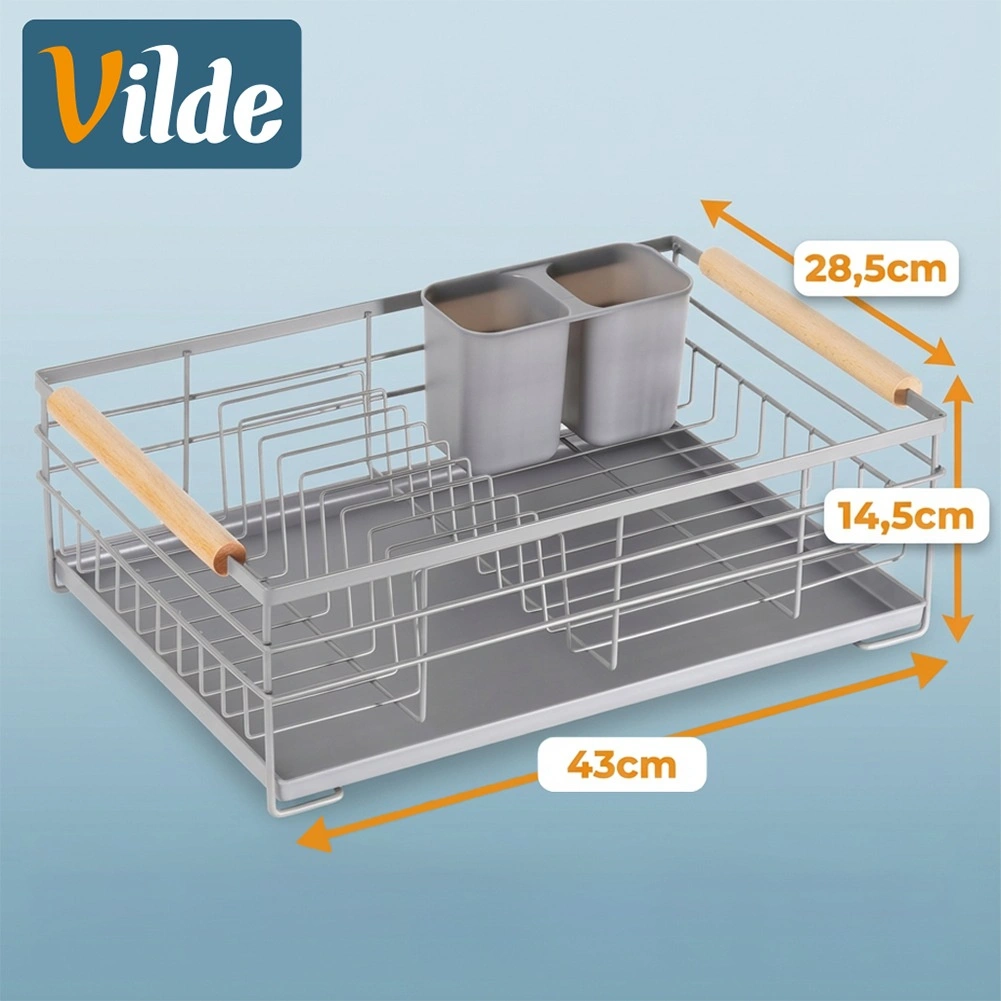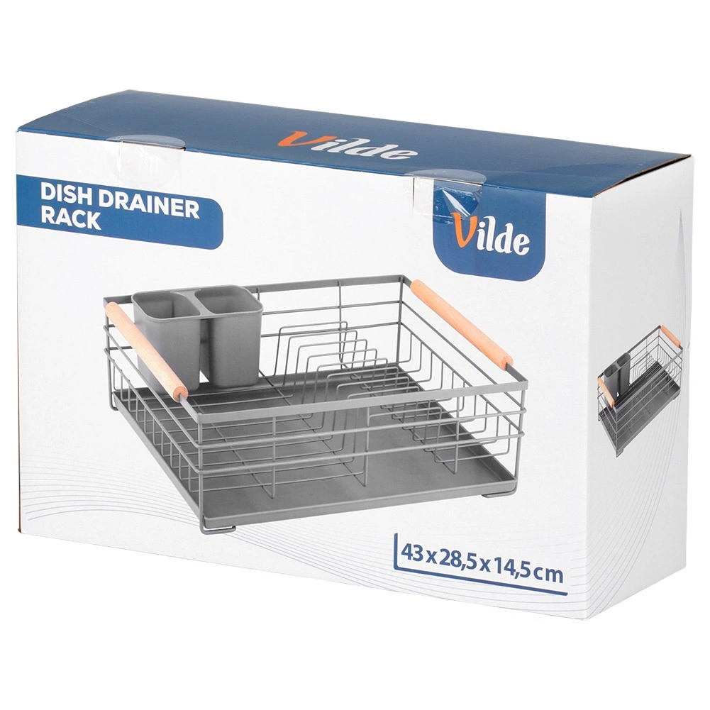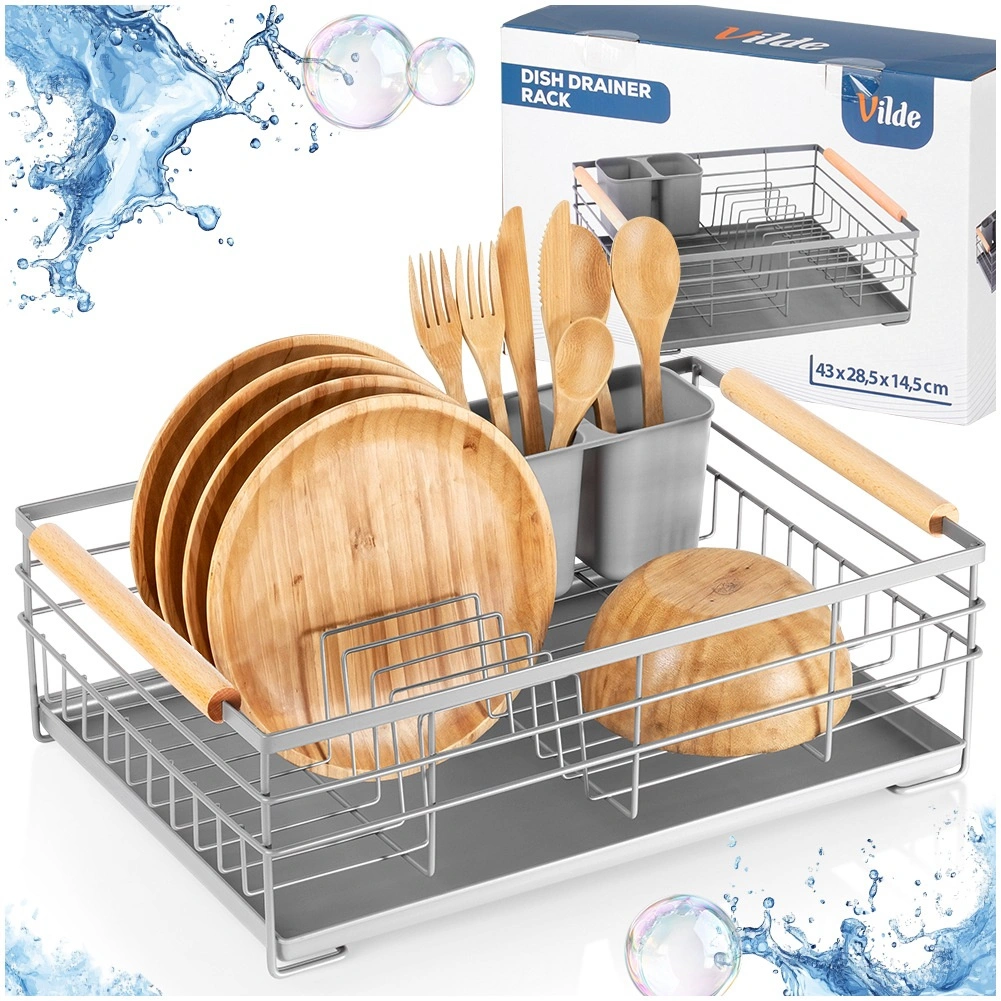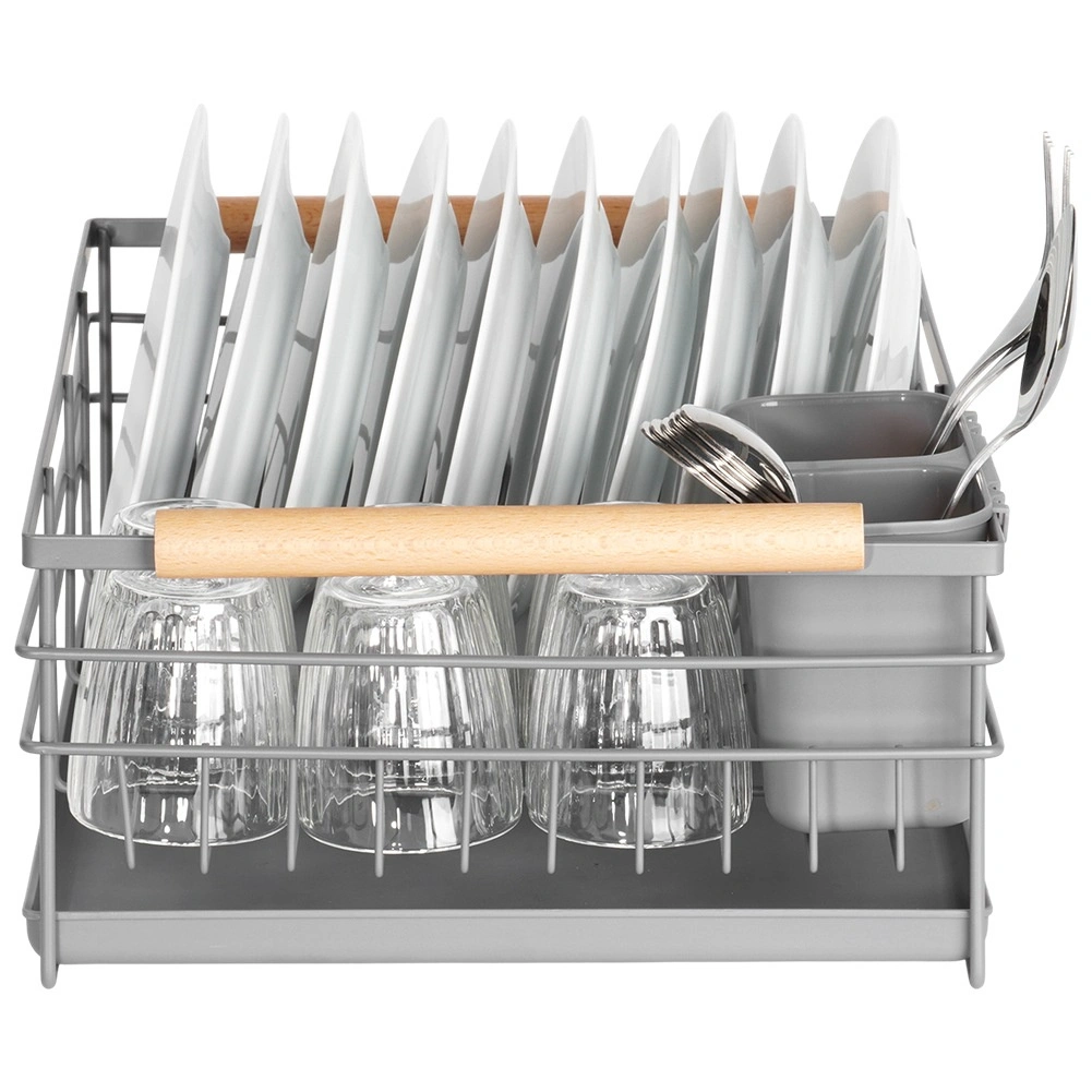 Praktičen siv odcejalnik za posodo z merami 43 × 28,5 × 14,5 cm prinaša red in suho delovno površino. Ponuja odstranljiv odcejalni pladenj, dvo-komorni košarici za jedilni pribor in prostor za do 10 krožnikov. Zahvaljujoč čvrsti kovinski konstrukciji in lesenim ročajem je stabilen, enostavno prenosljiv in odlično dopolni moderne in klasične kuhinje.
