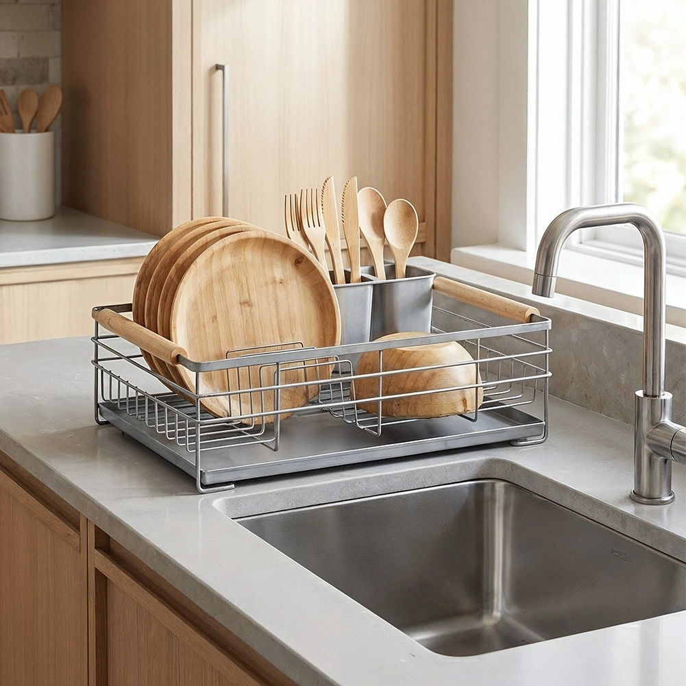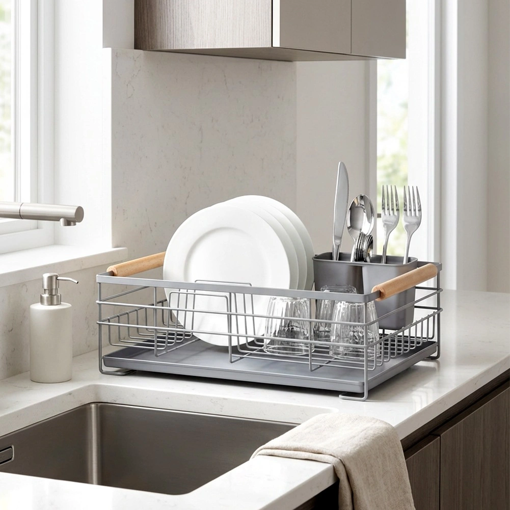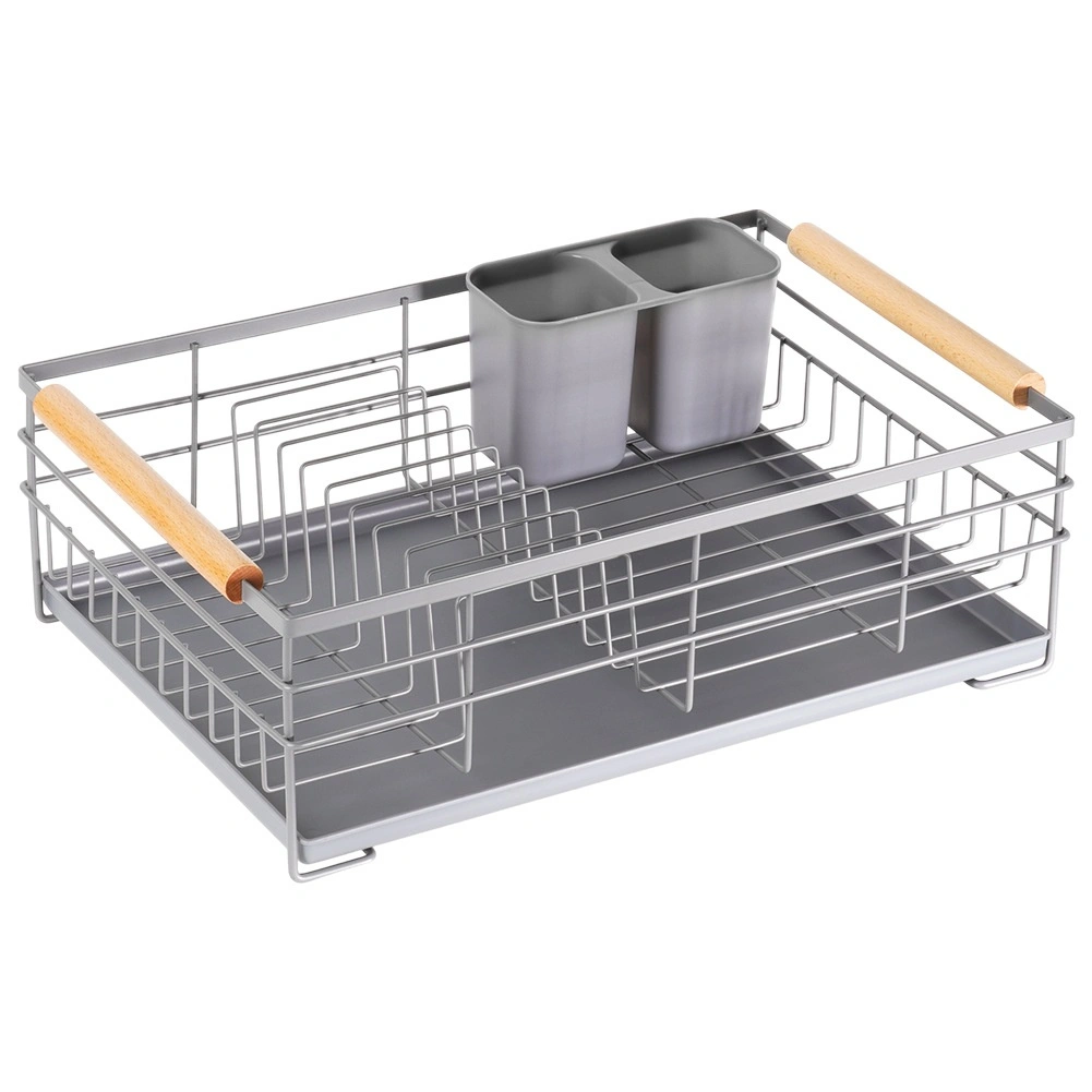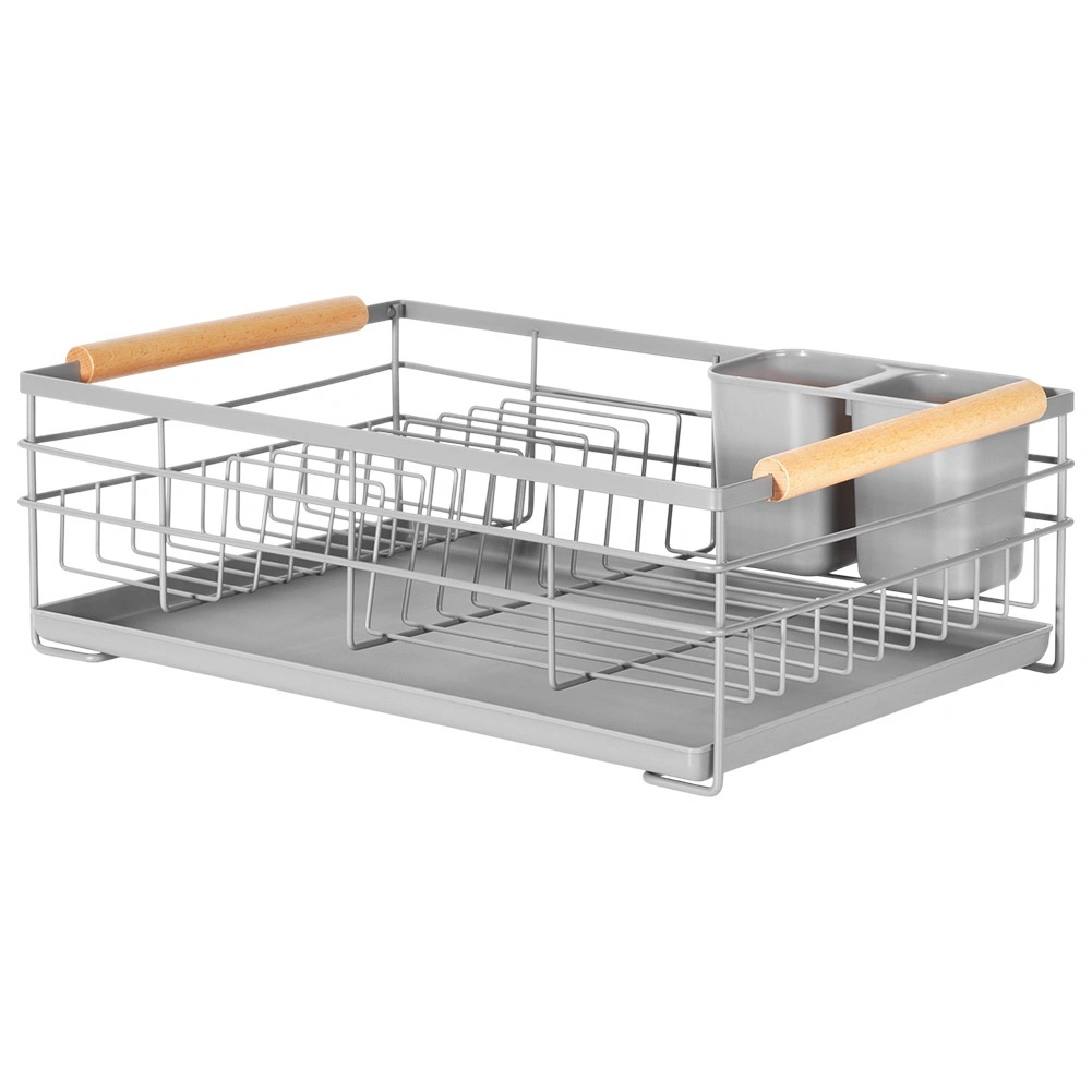 Praktičen siv odcejalnik za posodo z merami 43 × 28,5 × 14,5 cm prinaša red in suho delovno površino. Ponuja odstranljiv odcejalni pladenj, dvo-komorni košarici za jedilni pribor in prostor za do 10 krožnikov. Zahvaljujoč čvrsti kovinski konstrukciji in lesenim ročajem je stabilen, enostavno prenosljiv in odlično dopolni moderne in klasične kuhinje.