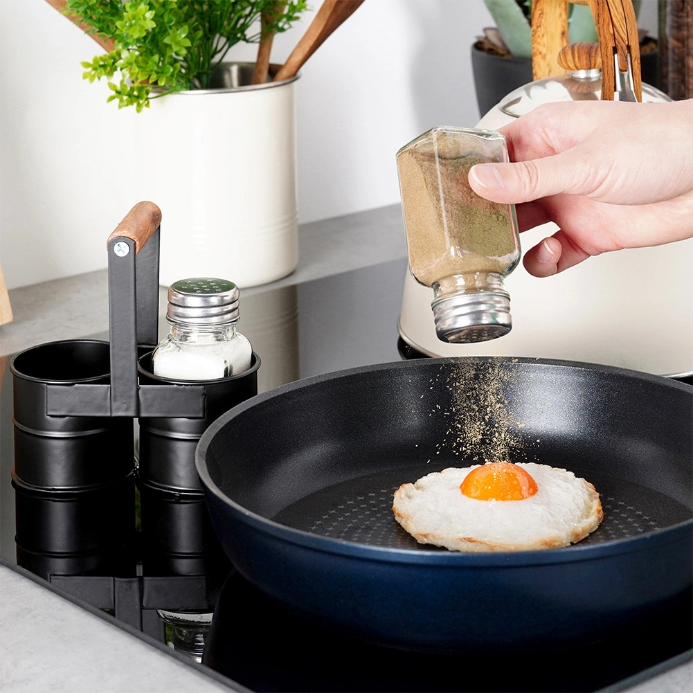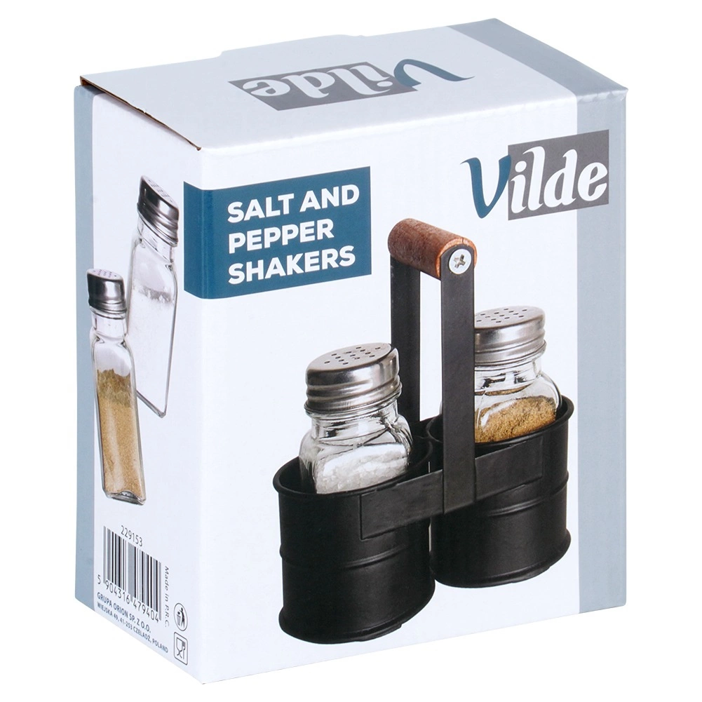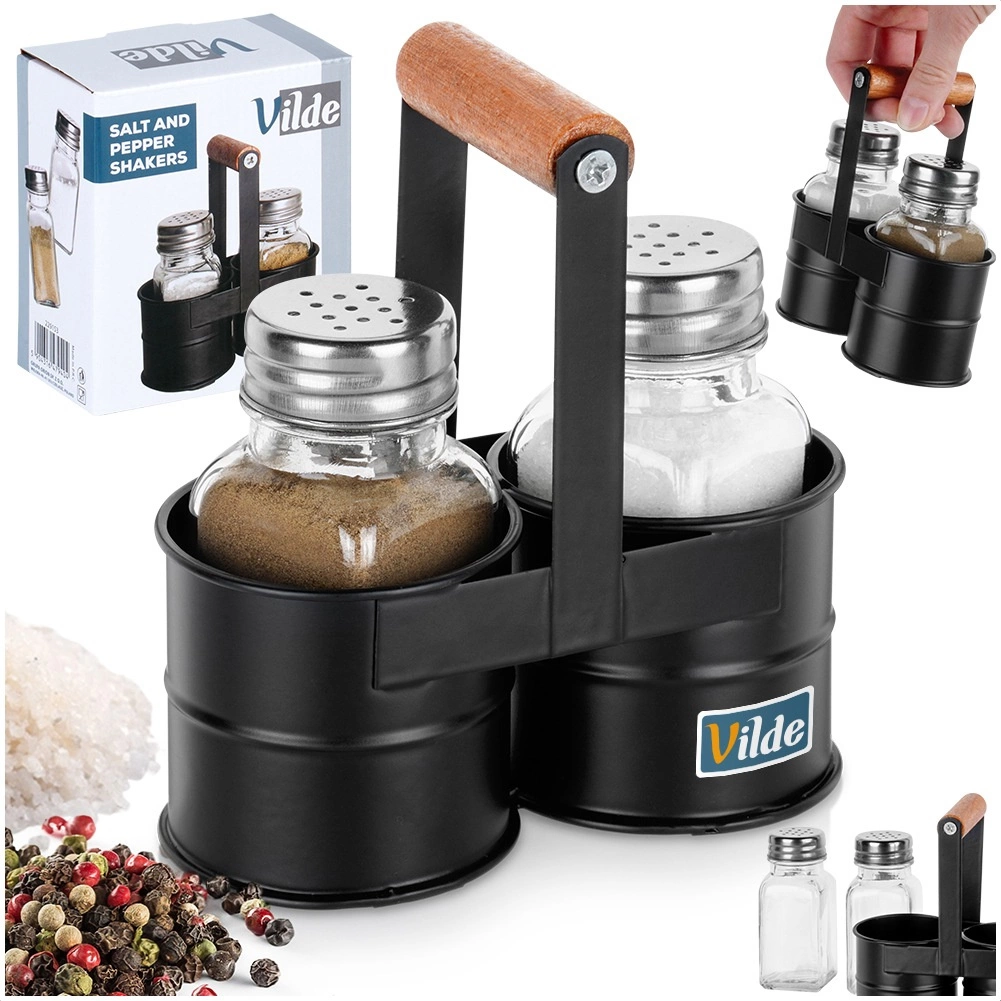 Ta 3-delni komplet združuje dve prozorni stekleni posodici (80 ml) s kovinskimi pokrovčki ter odporno črno stojalo z lesenim ročajem. Zahvaljujoč drobnim odprtinam v pokrovčkih zlahka dozirate natančno količino začimb brez tveganja prekomernega soljenja ali popranja.